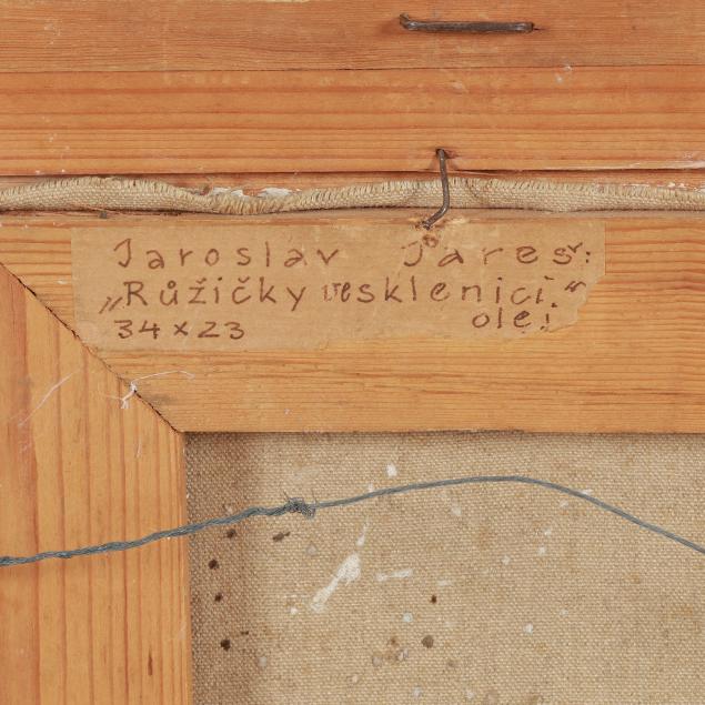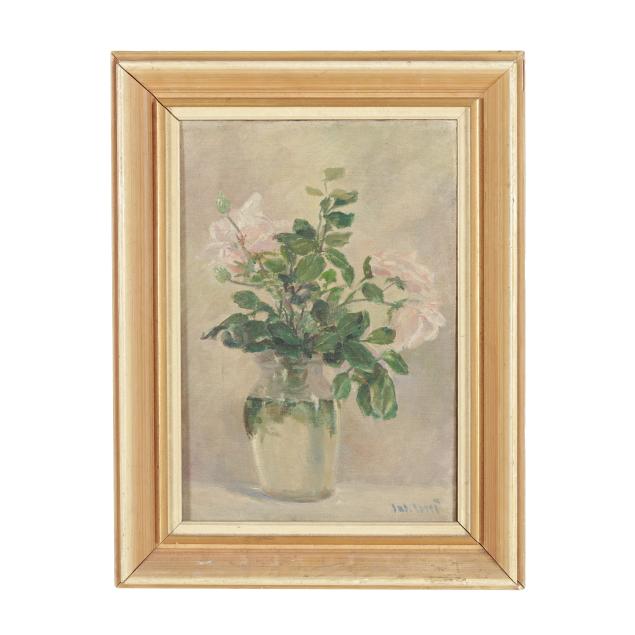 Roses in Glass, oil on canvas, signed at lower right, titled to verso, presented in a wood frame.