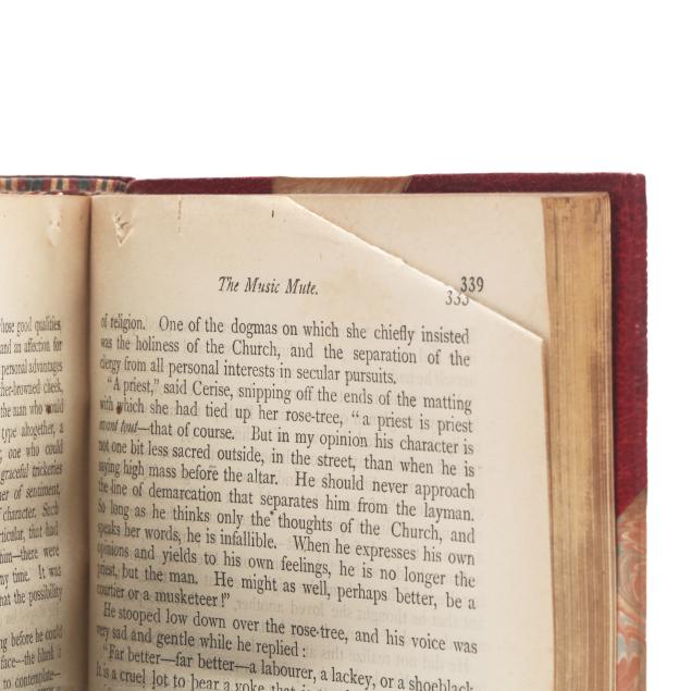 A Private High Point, North Carolina Collection Occasional light wear to boards such as rubbing to extremities and foxing or fading to marbled paper; interiors with very mild toning, scattered foxing (concentrated at preliminaries and endpapers), and occasional ghosting and handling wear such as a folded corner; a few novels with heavier wear including one with a handful of leaves with tears and folds, one with numerous leaves with wear at upper margin, and one with binding abnormalities; some with ribbon bookmarks or remnants; text pages clean. Volumes range from very good minus to near fine.