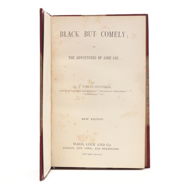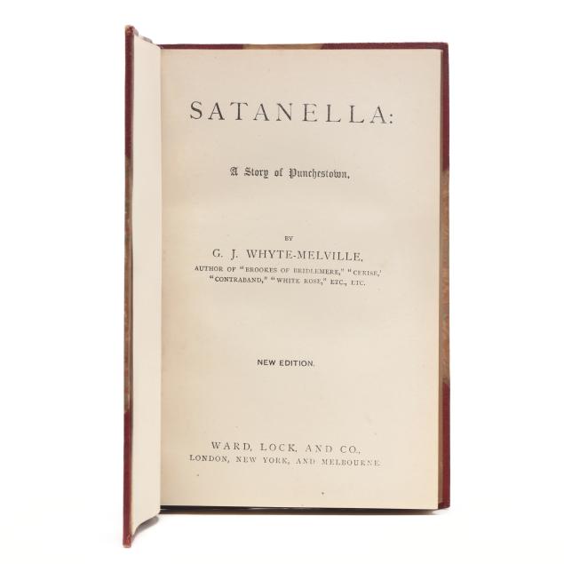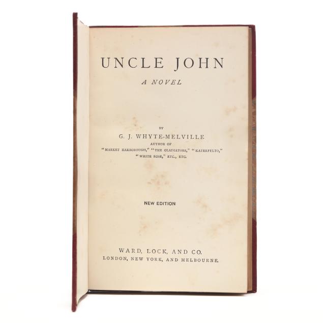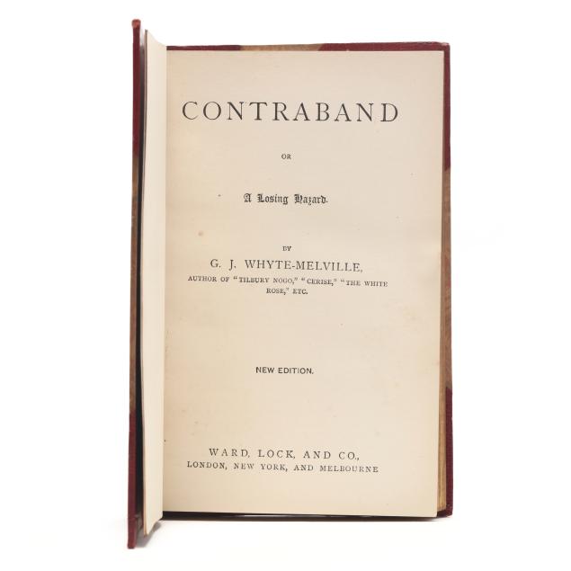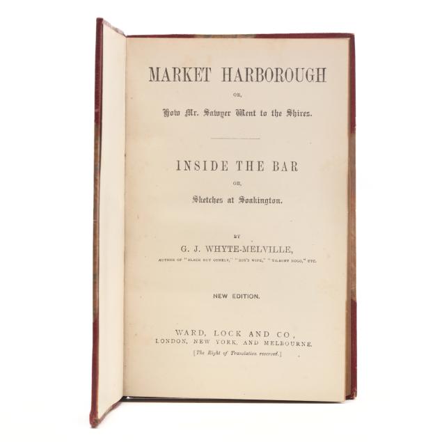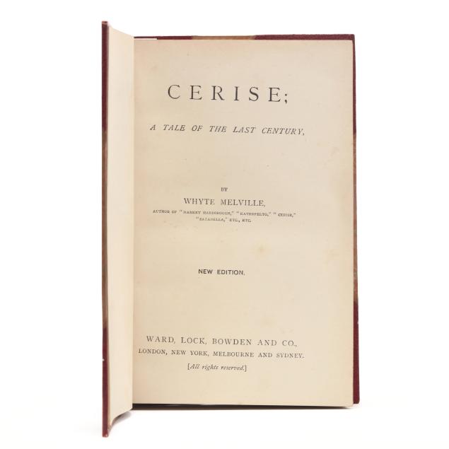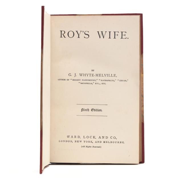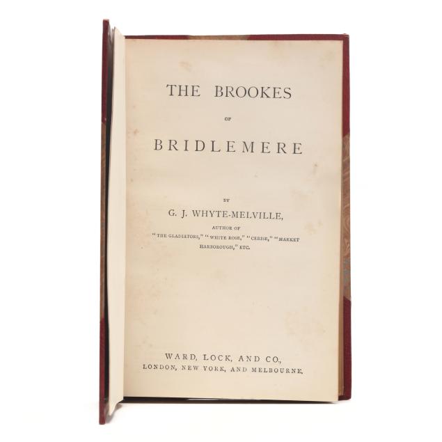 G. J. Whyte-Melville. [WHYTE-MELVILLE'S NOVELS]. (8) vols. London, New York, and Melbourne: Ward, Lock, and Co., [n.d.]. Various editions; most stated New Edition. Uniformly bound in half red morocco over marbled paper-covered boards, spines with gilt-lettered and decorated compartments and raised bands, with marbled endpapers and all edges gilt; stamped "MORRELL BINDER" on first free endpaper verso. Small 8vo. To include: