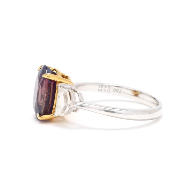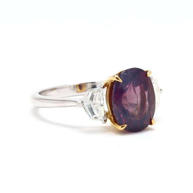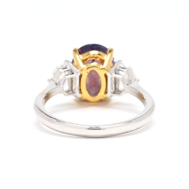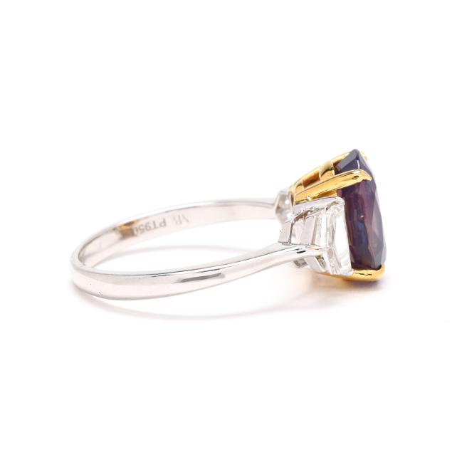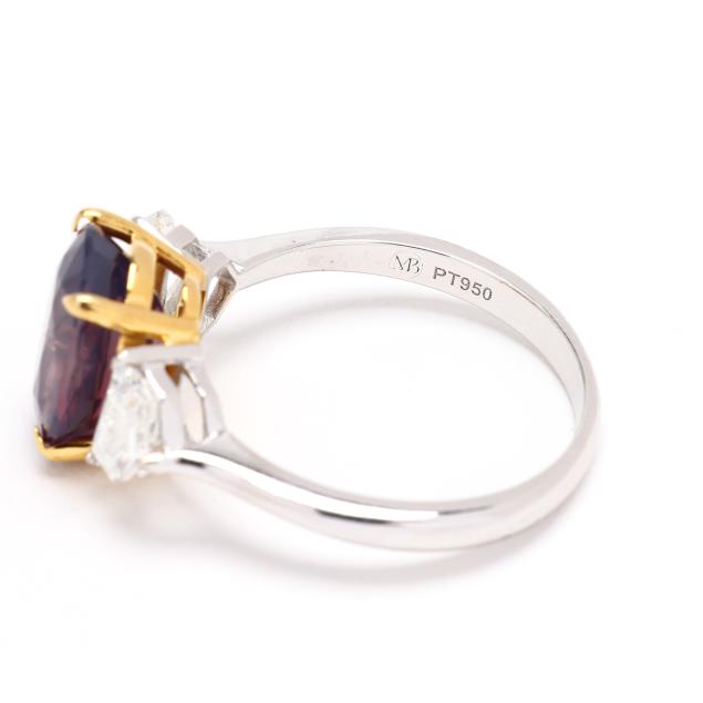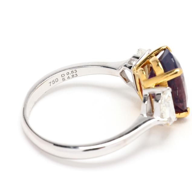 centered on an oval cut fancy sapphire (11.17 x 8.58 x 5.97mm) weighing 4.83 carats (actual) in yellow gold prong setting, the shoulders set with modified shield cut diamonds weighing .83 total carat (H-I color, VS2-SI1 clarity), on a platinum shank, stamped PT950, with maker's mark MB, 750, and D 0.83 / S 4.83 for stone weights.