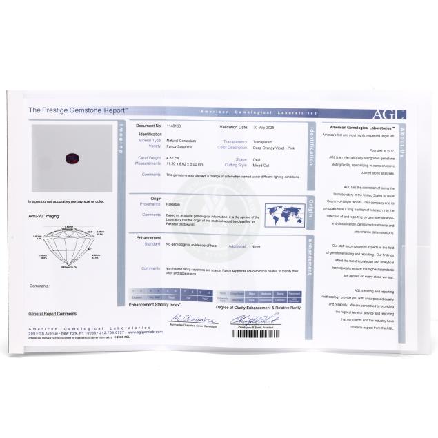 With AGL report stating Natural Corundum / Fancy Sapphire with no gemological evidence of heat and origin of Pakistan (Batakundi).