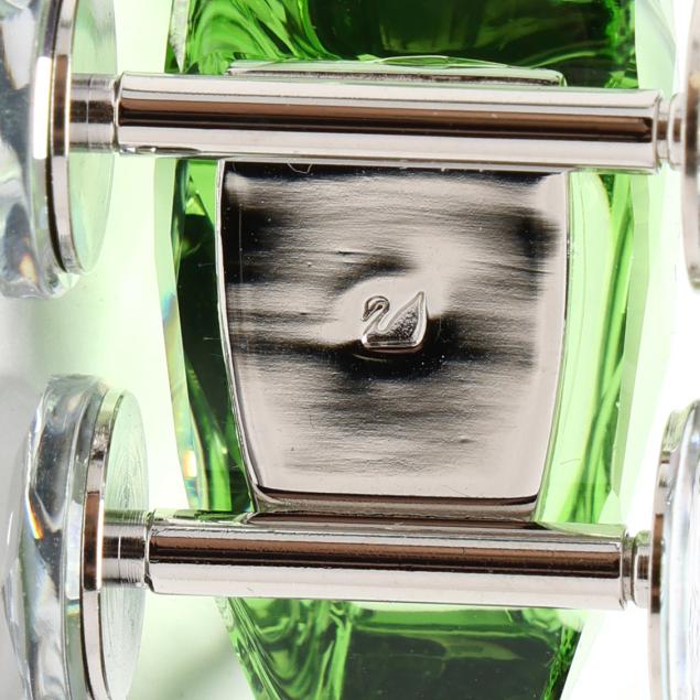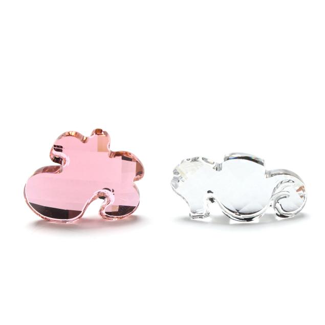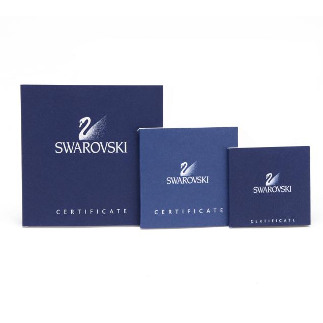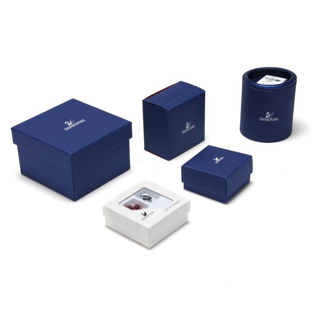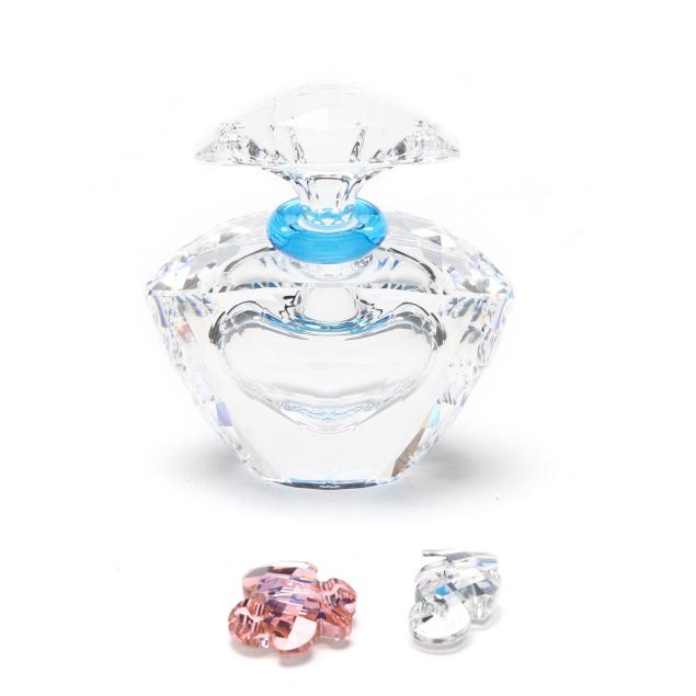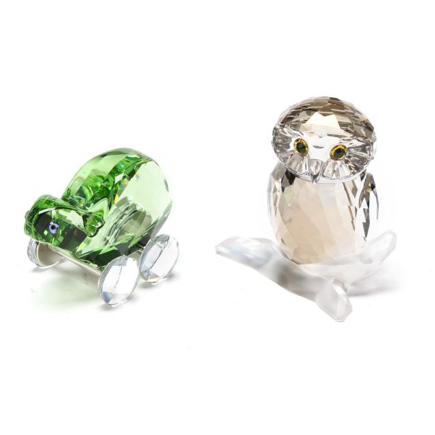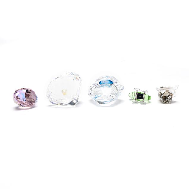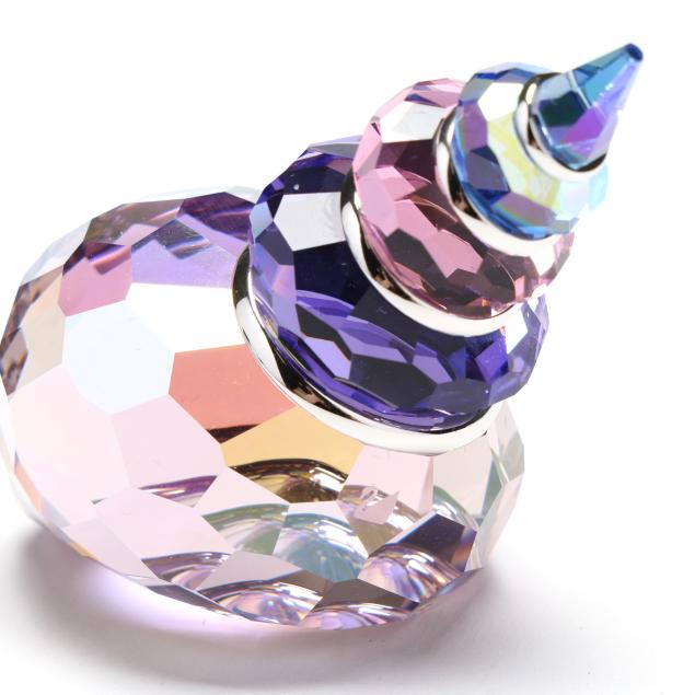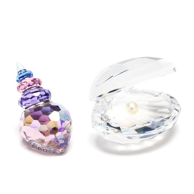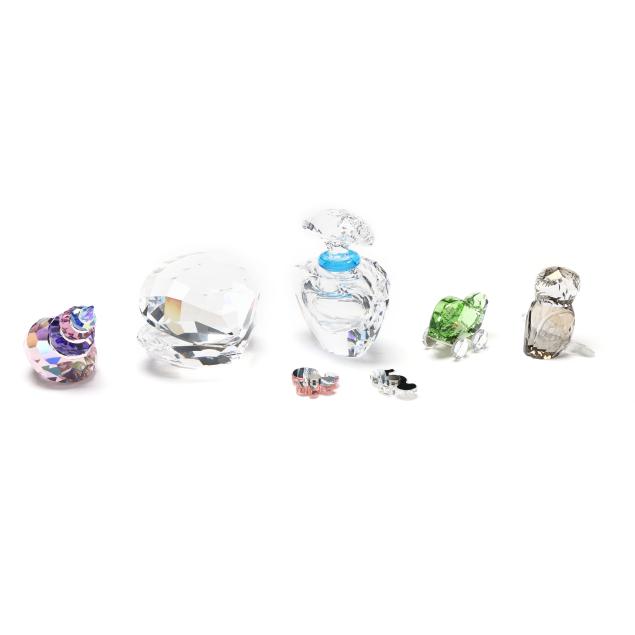 Austria, (7) pieces to include an open oyster with a pearl; a multicolor conch shell with silvered mounts; a perfume bottle with stopper; a small owl perched on frosted branch; a turtle on four wheels; and (2) sea life magnets; all but perfume bottle presented with original boxes and all with Swarovski company mark.