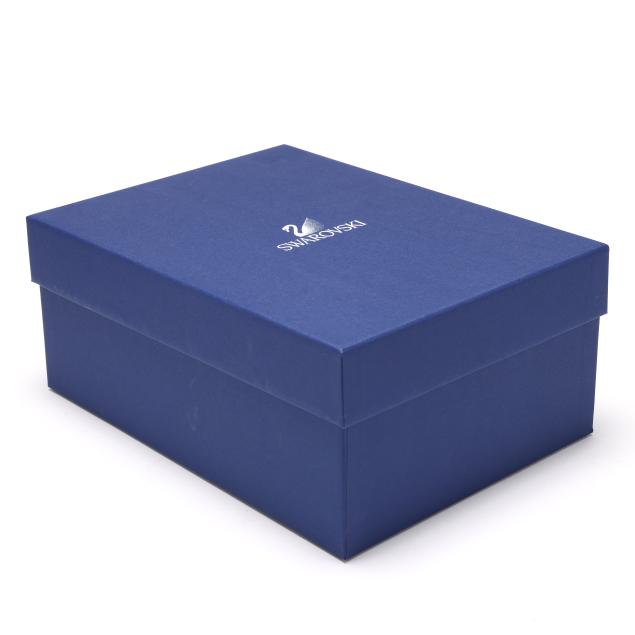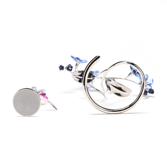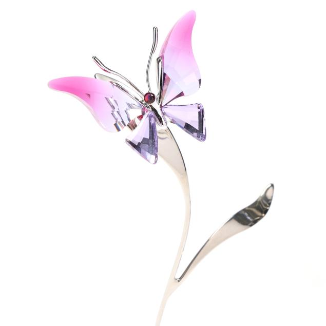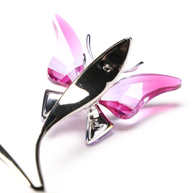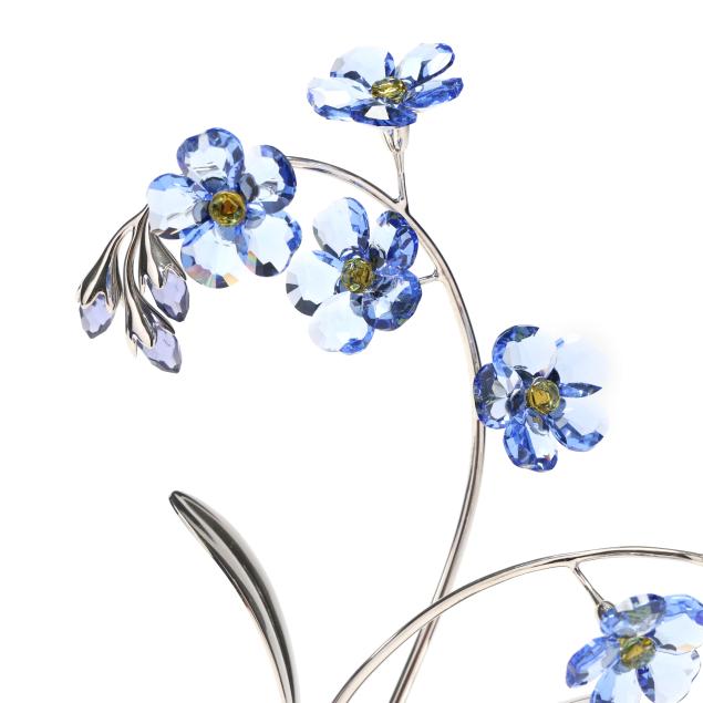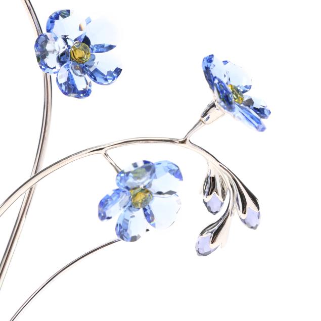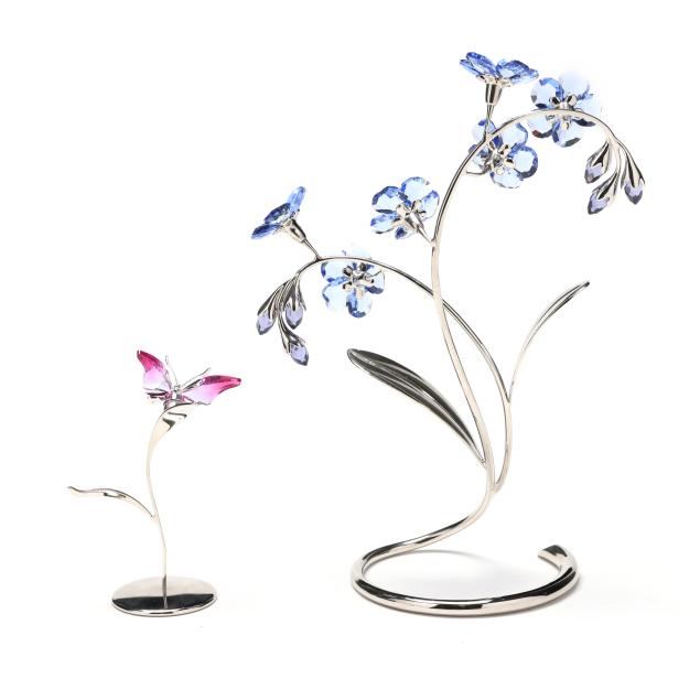 Austria, to include a group of blue flowers and buds on silvered metal stem pedestal; and a butterfly on silvered metal stem pedestal, butterfly fitted with magnet to be moved or removed as desired, both with Swarovski mark, blue flower bouquet presented with original box.