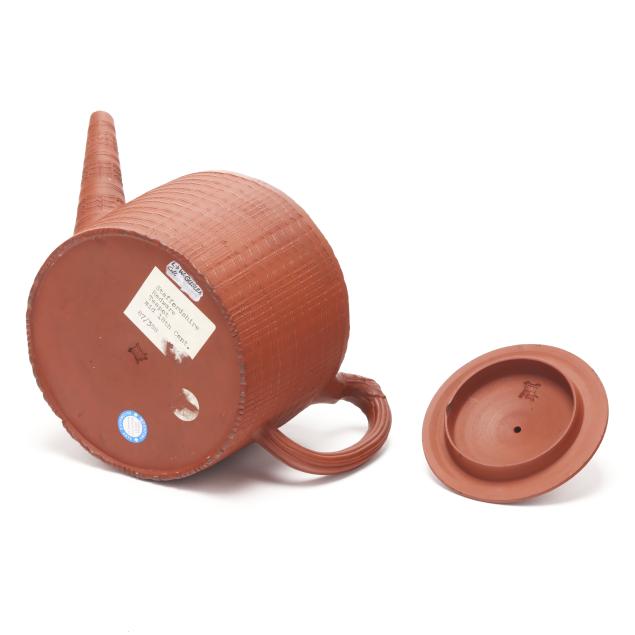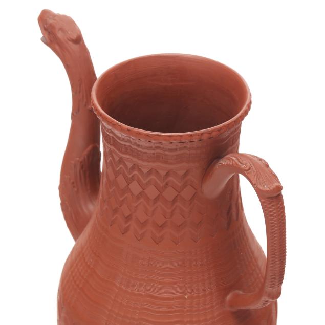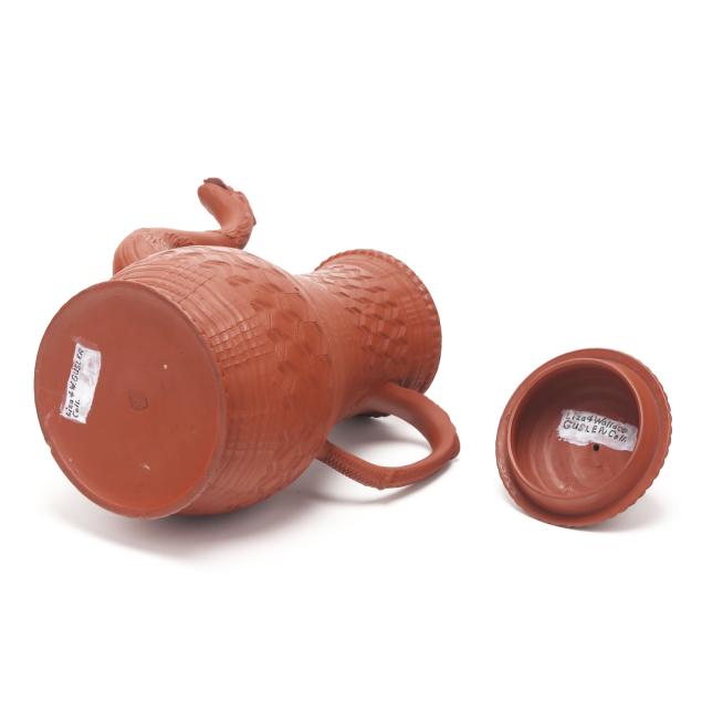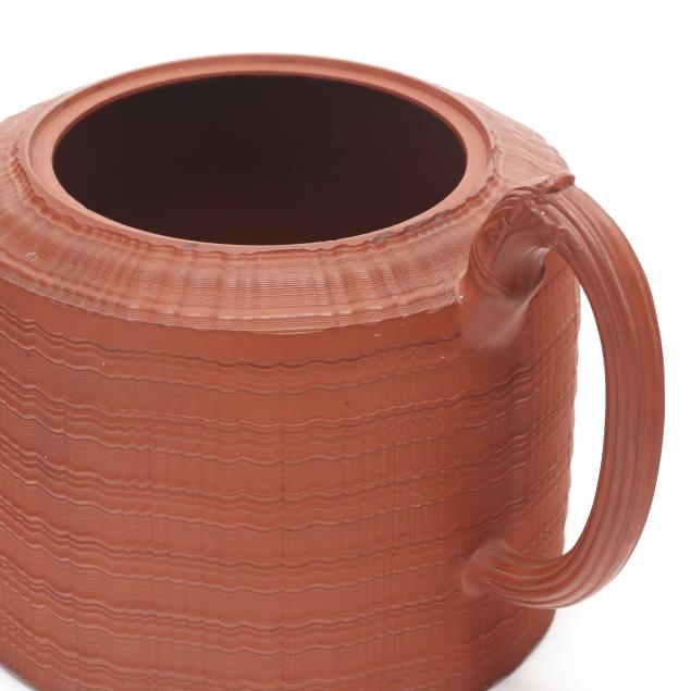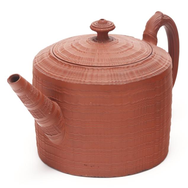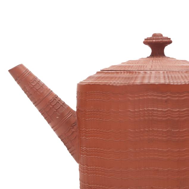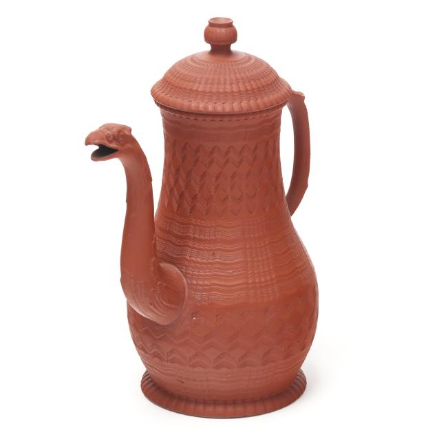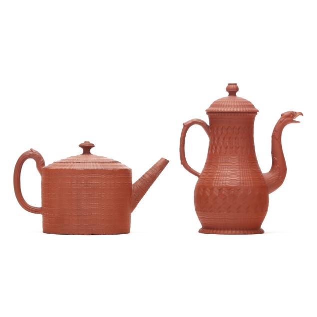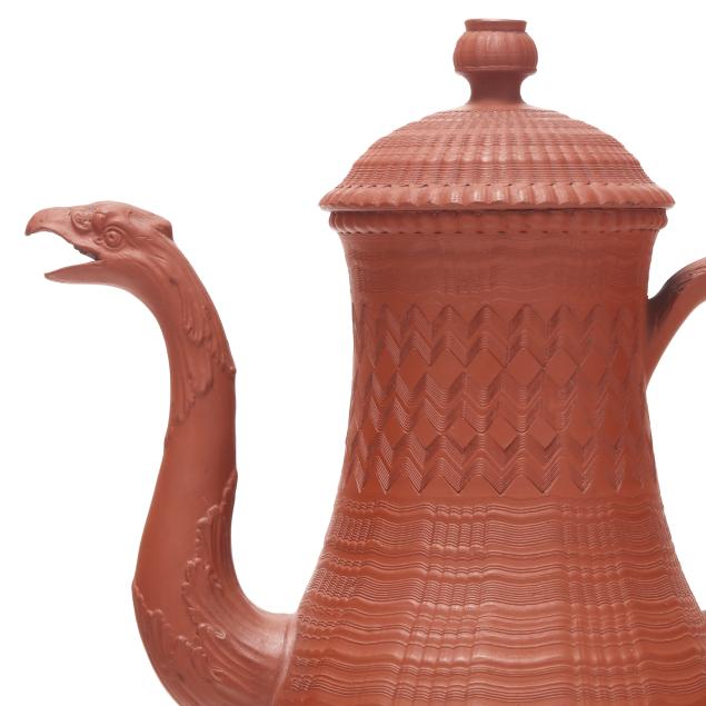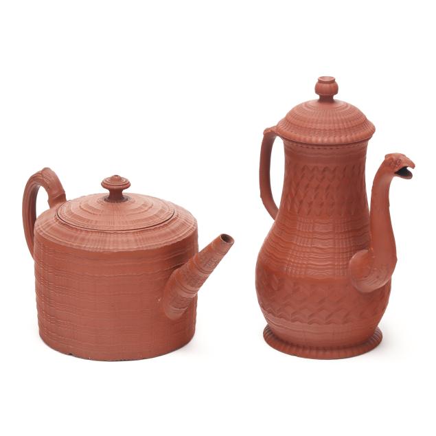 British, circa 1760s, both featuring fine engine turned decoration extending from the cover to the bottom rim of the pot, punch pot of cylindrical form with reeded handle emerging from a foliate upper handle, the pot and cover undersides impressed with pseudo-Chinese mark (5 1/2 x 10 1/4 x 6 in.); the coffee pot of baluster form featuring an eagle spout, pot underside impressed with pseudo-Chinese mark (9 3/4 x 8 x 5 in.)