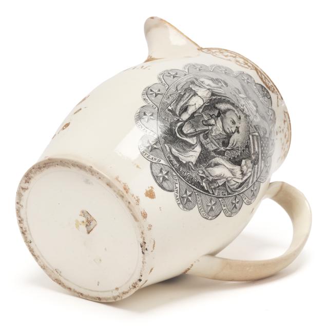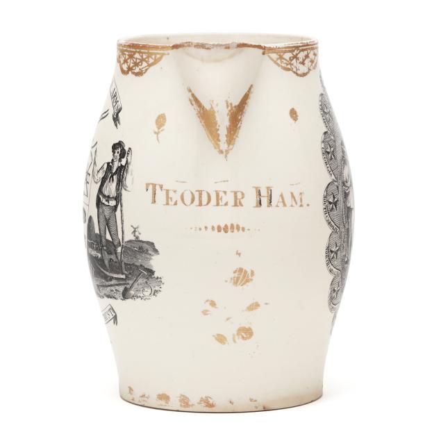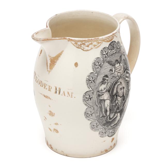 British, circa 1800, lead glazed creamware with Americana commemorative transfer and neoclassical style gilt decoration, inscribed “Teoder Ham” in gilt beneath the spout, obverse featuring a portrait of George Washington with Fifteen States, the reverse with “The Farmers Arms”; further research is needed to determine who "Teoder (Theodore) Ham" might be and whether it was a custom commissioned work for this individual.