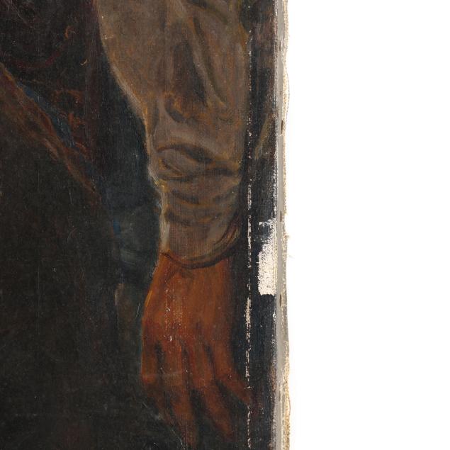 Paint loss around wrapped edges of canvas, particularly extensive along lower edge of canvas; allover craquelure with some paint lifting and loss; surface grime; stretcher marks; inspection under UV light shows a later varnish, but no evidence of retouch.