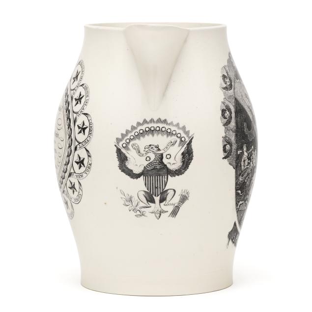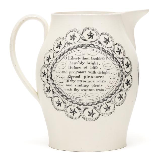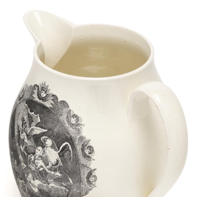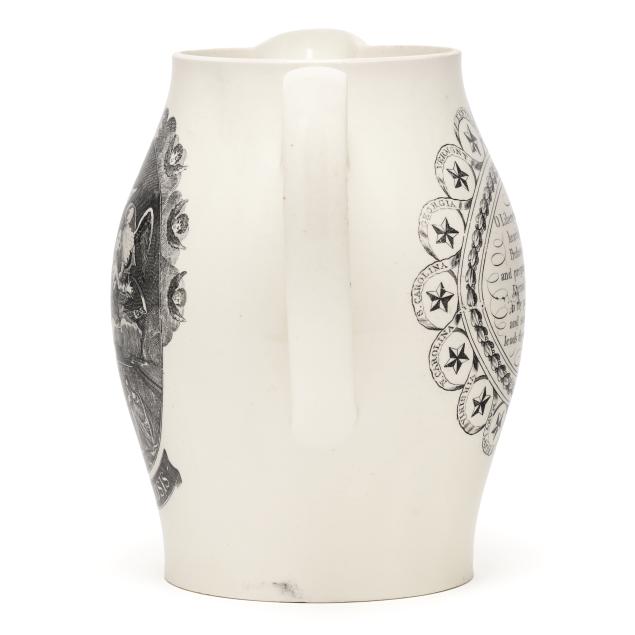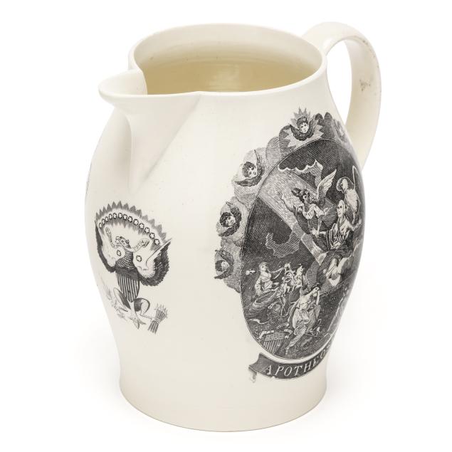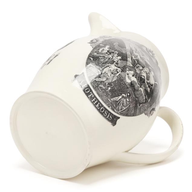 British, circa 1800, lead glazed creamware with black transfer print, the obverse scene after a print by John James Barralet (Irish, circa 1747-1815), featuring Washington raised from his tomb by winged figures of Immortality and Father Time, flanked by various allegorical figures within an oval vignette with seven putti surround, the reverse depicting fifteen state banner centering stars with laurel swag surrounding Joseph Addison's poetic verse, with eagle Arms of the United States beneath the spout.