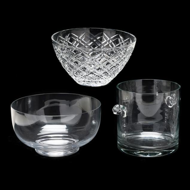 Georgetown round bowl (5 3/8 x 9 3/4 in.); and a scroll handled ice bucket (7 1/4 x 10 1/4 in. with handles), all marked to underside.
