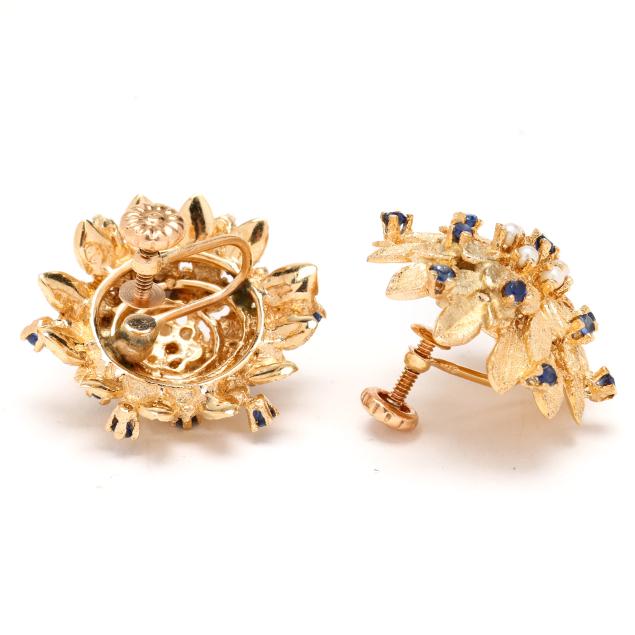 Gold, Sapphire, and Seed Pearl Floral Motif Earrings