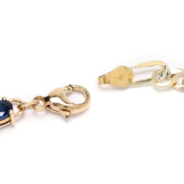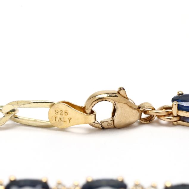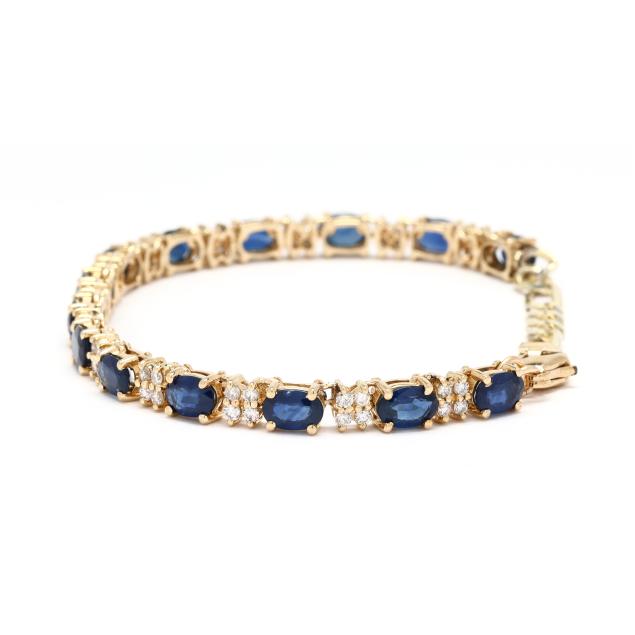 Gold bracelet prong set with repeating oval cut sapphires weighing approximately 8.40 total carats alternating with clusters of four full cut round diamonds weighing approximately 1.00 total carat (H-I color, SI1-SI2 clarity), completed with a gold-filled lobster clasp stamped 14/20 GF and vermeil extender chain stamped 925, bracelet testing 14KT.