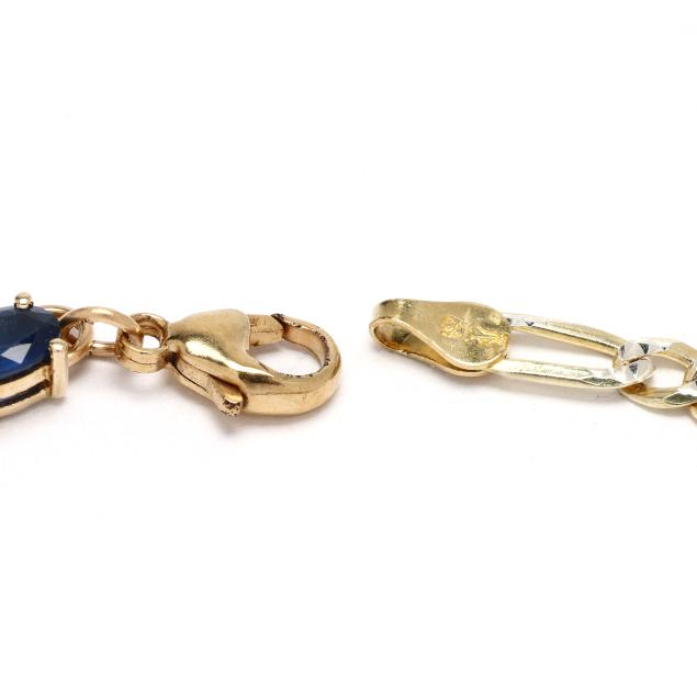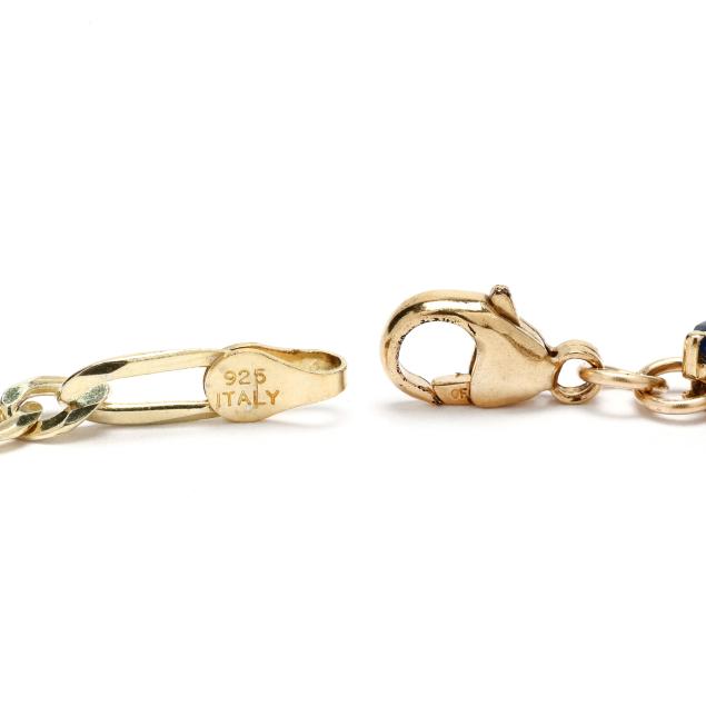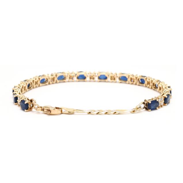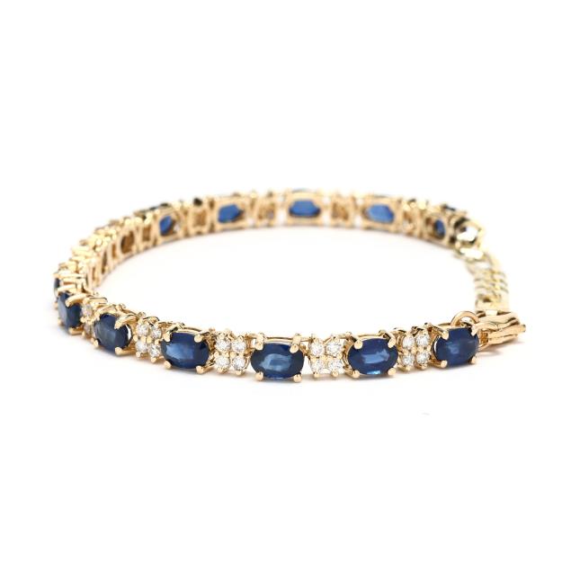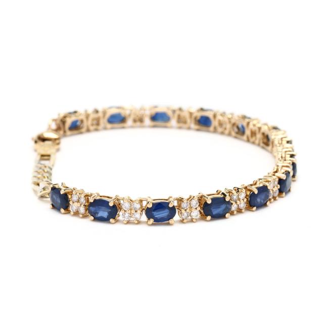 Gold bracelet prong set with repeating oval cut sapphires weighing approximately 8.40 total carats alternating with clusters of four full cut round diamonds weighing approximately 1.00 total carat (H-I color, SI1-SI2 clarity), completed with a gold-filled lobster clasp stamped 14/20 GF and vermeil extender chain stamped 925, bracelet testing 14KT.