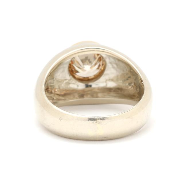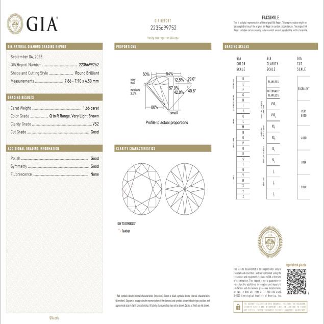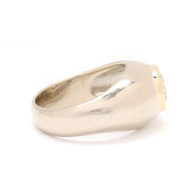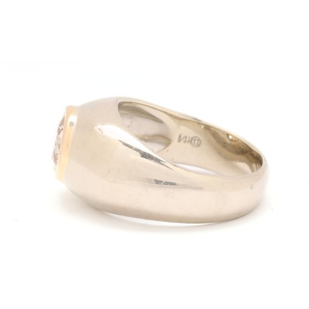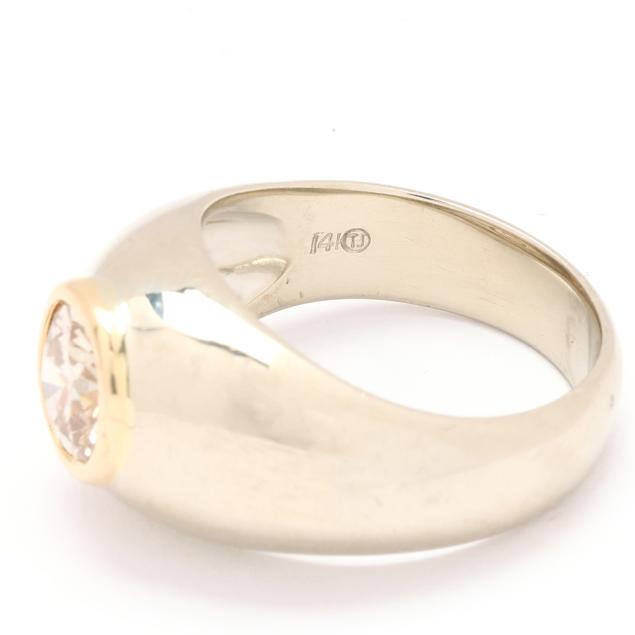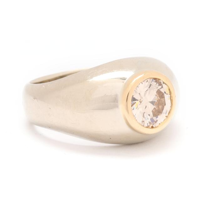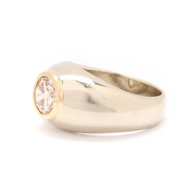 centered on a bezel set round brilliant cut diamond (7.86 - 7.90 x 4.50 mm) weighing 1.66 carats (actual) (Q-R Range, Very Light Brown color, VS2 clarity) in a white gold wide domed ring with gold bezel, stamped 14K TJ.