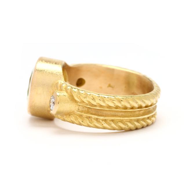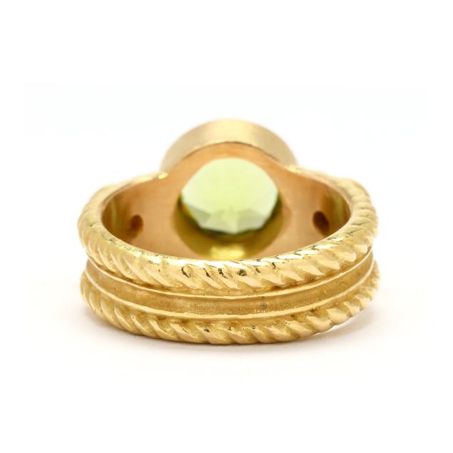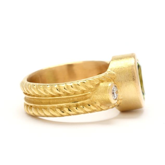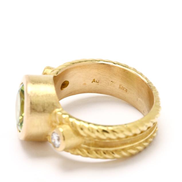 Centered on a bezel set round cut peridot (8mm) weighing approximately 2.00 carats on a classical style shank with rope twist borders, the shoulders set with two bezel set full cut round diamonds (2.5mm), stamped 18K and with partial fineness mark.