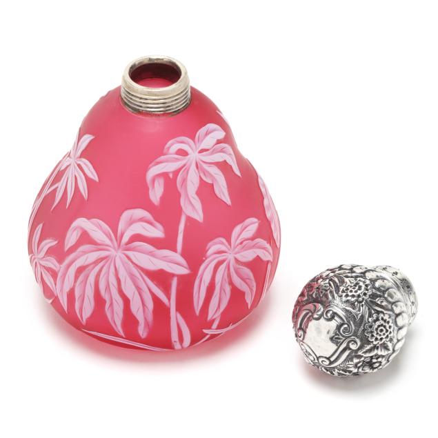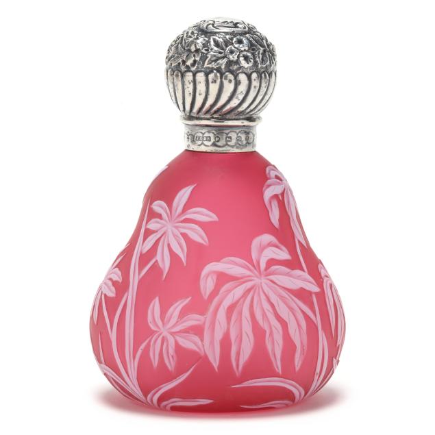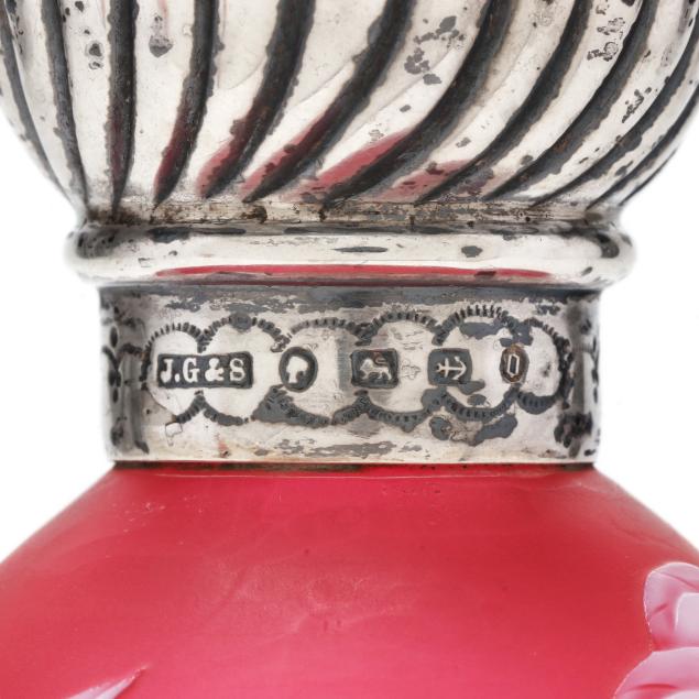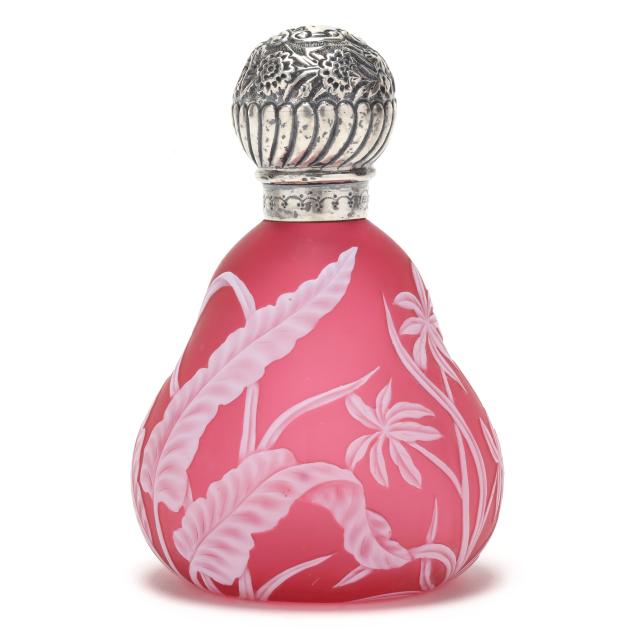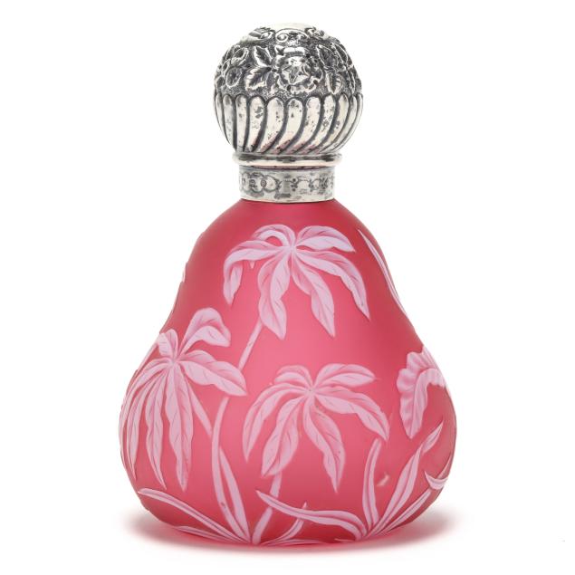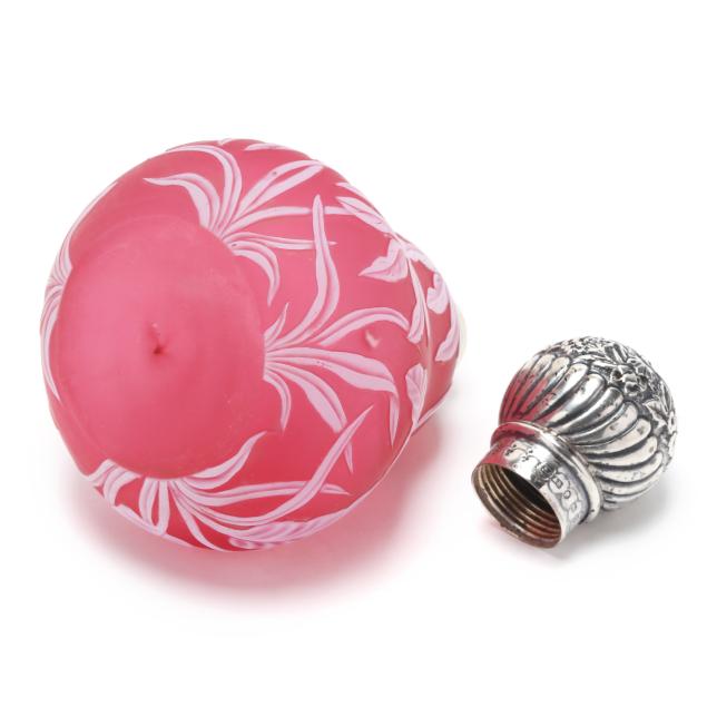 19th century, blown cranberry satin glass with white overlay in cut frond motifs, repousse sterling lid with hallmarks, underside of glass with ground edge, unmarked.