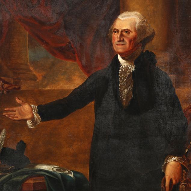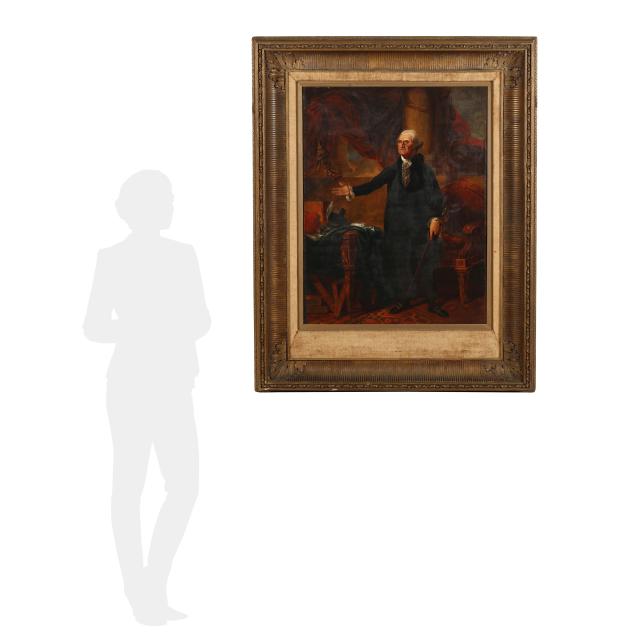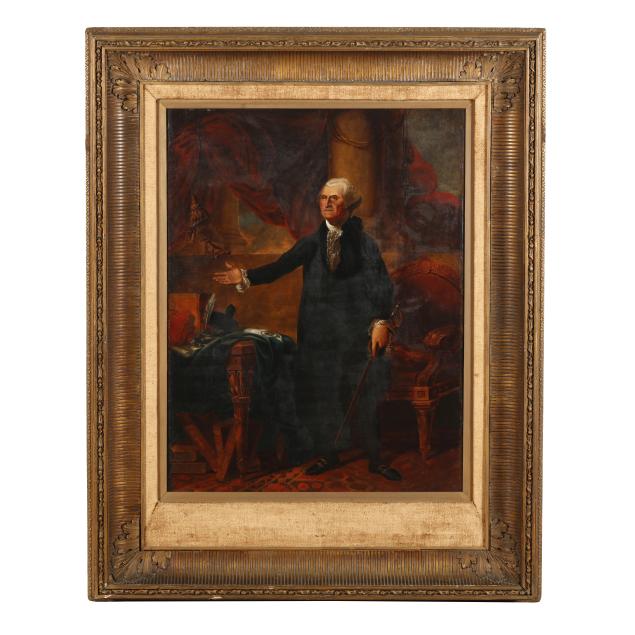 The Lansdowne Portrait of George Washington (1796) by Gilbert Stuart presents the president as a civilian leader rather than a military hero. Commissioned as a diplomatic gift for British Prime Minister William Petty, the life-size painting depicts Washington in a black suit, gesturing with calm authority amid symbols of the young republic—books of law, a rainbow of hope, and the federal eagle. It remains one of the most enduring images of Washington and American democracy.
