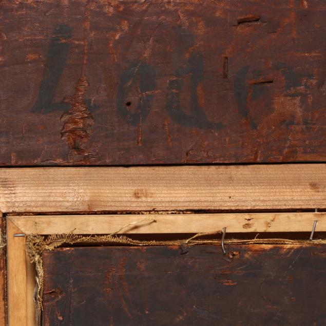 Stable craquelure; some areas of canvas loss visible near frame edges; staining to liner.