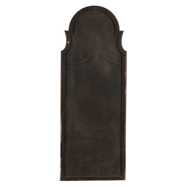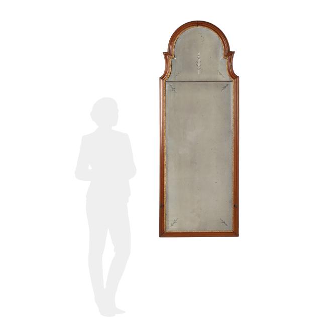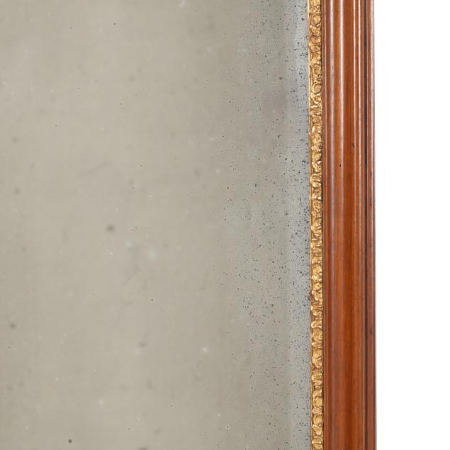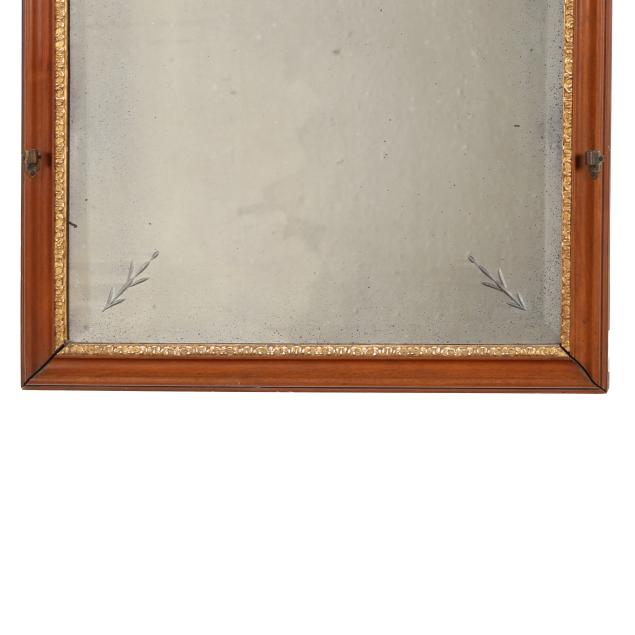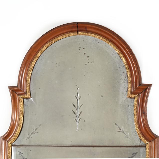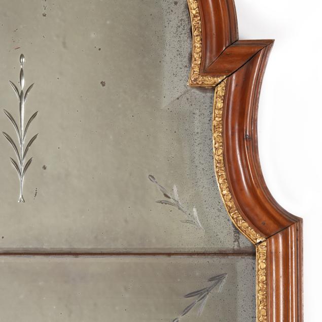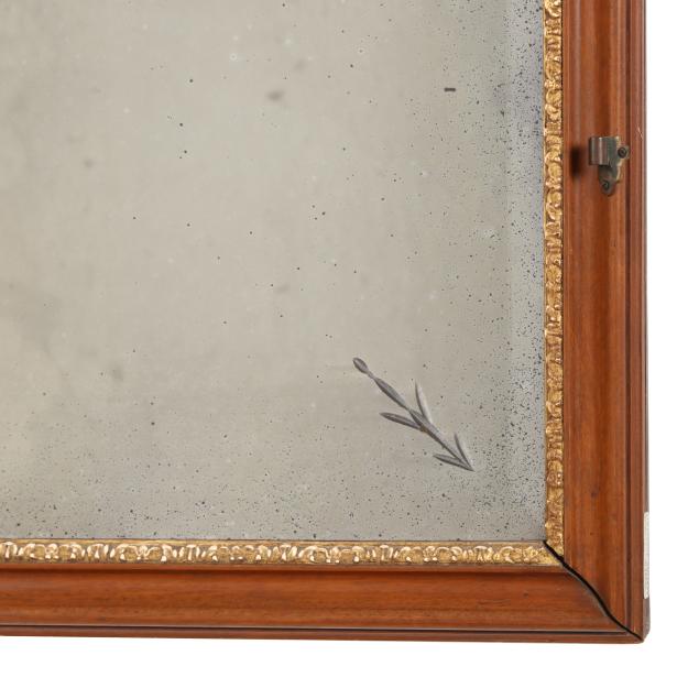 Circa 1900, shaped pediment with conforming beveled edge and underside cut foliate motifs over a rectangular mirror with repeating motifs at upper corners, molded walnut frame with gilt fillet.