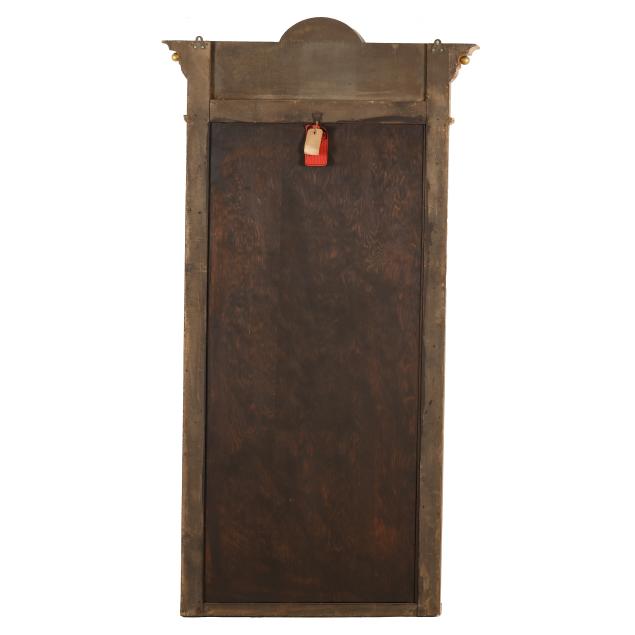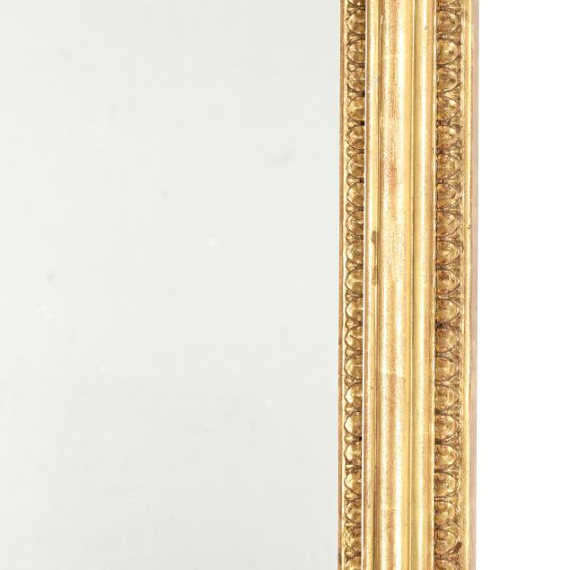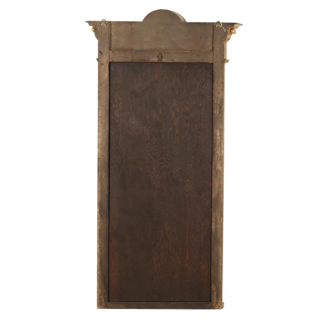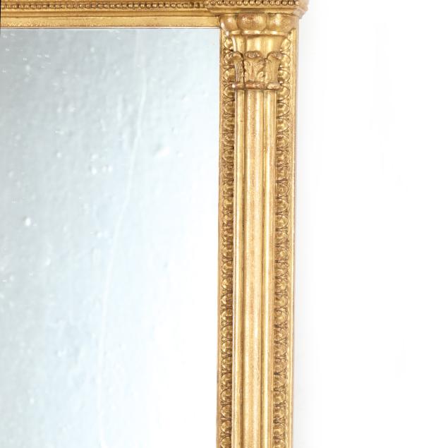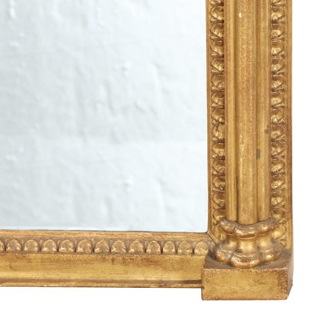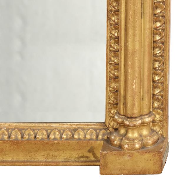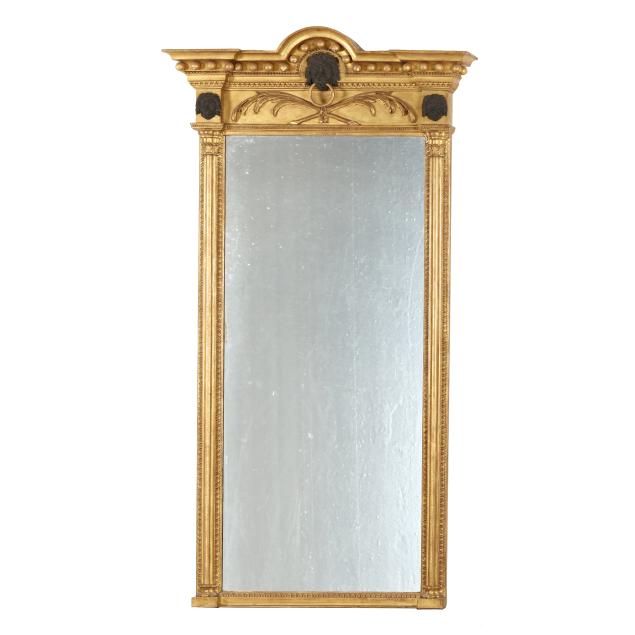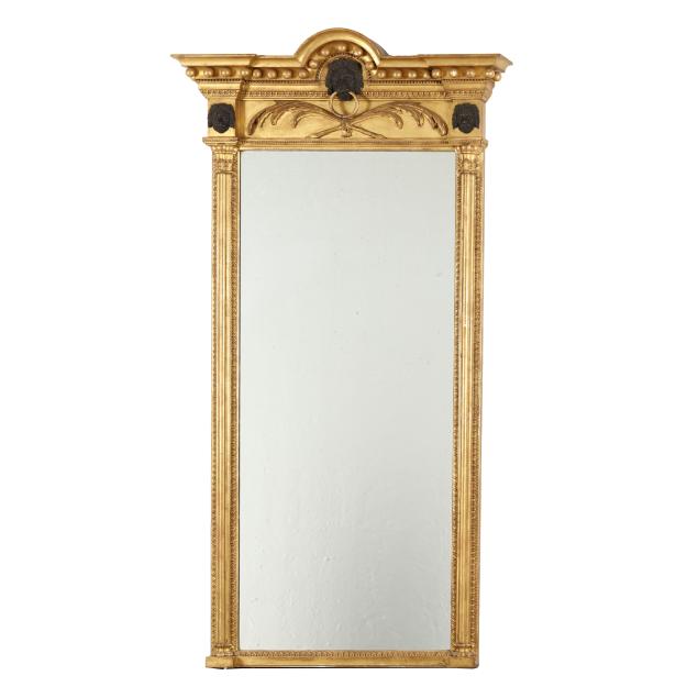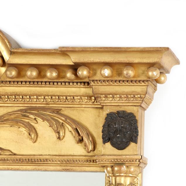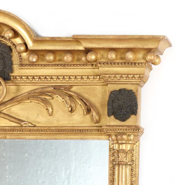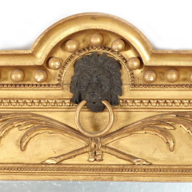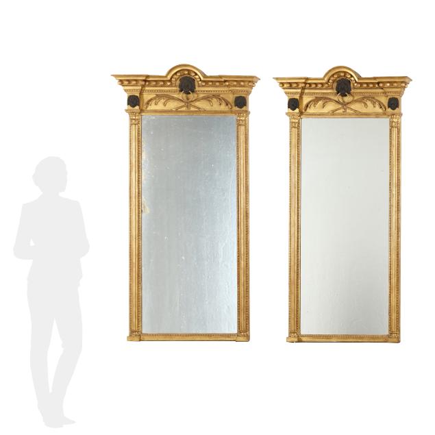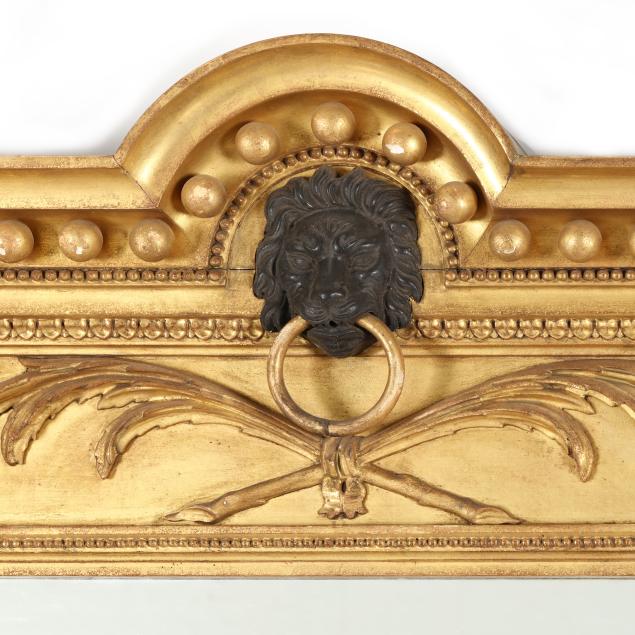 Early 20th century, carved and gilt wood frames with arched molded cornice with applied ball ornaments, ebonized lion masks and plumes, reeded column stiles with egg and dart borders.
