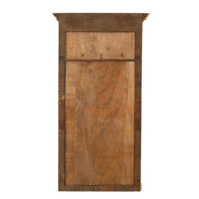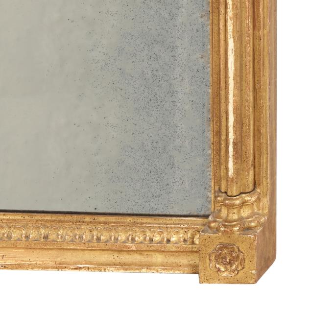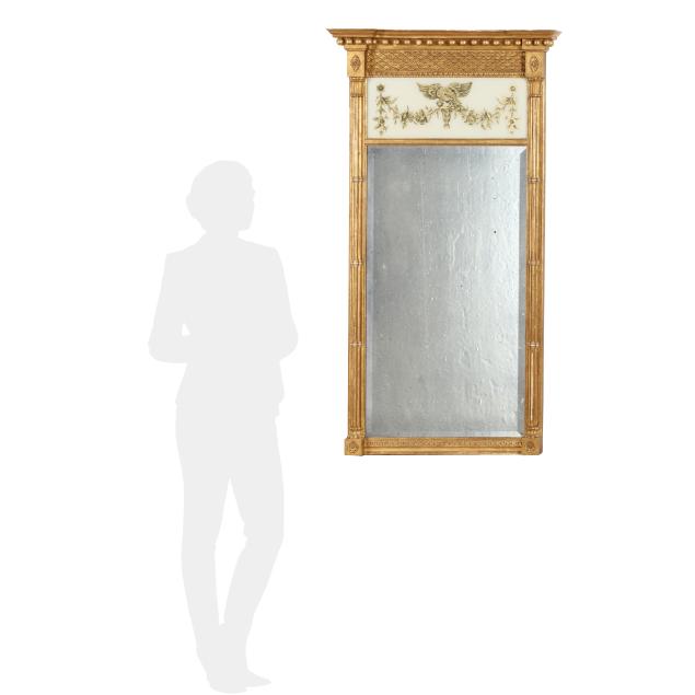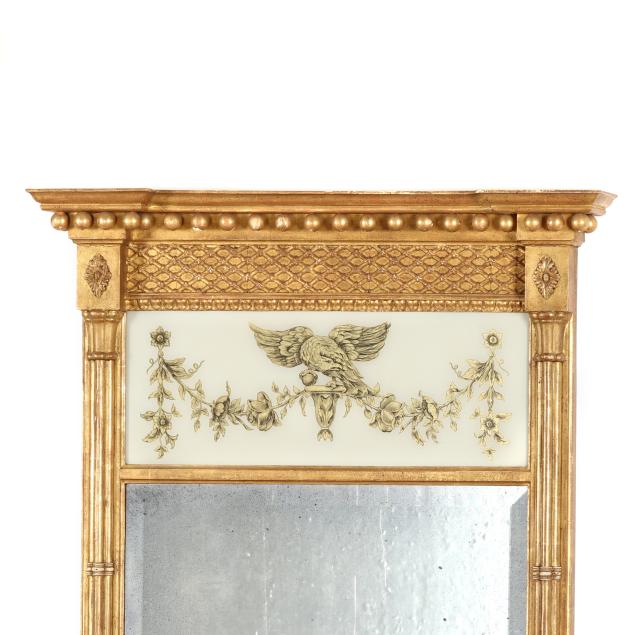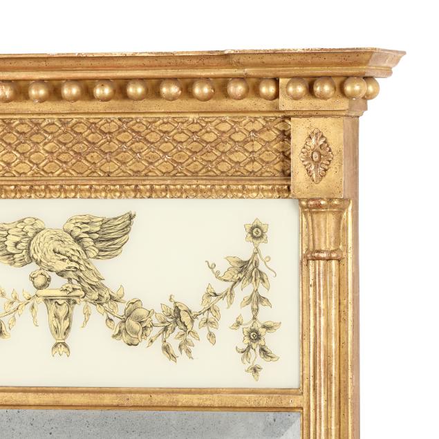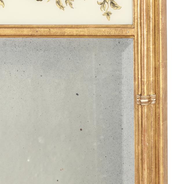 Second half 20th century, antiqued gilt wood frame with ball ornaments and lattice frieze over a gilt pen-work eglomise panel featuring each and floral swag, rectangular beveled mirror with trefoil column stiles over rosette blocks.