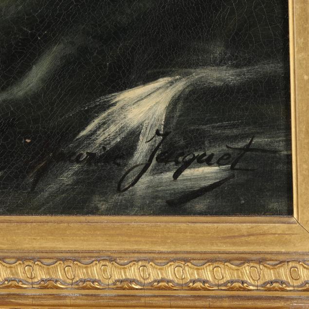 Maurice Jacquet was a painter known for his elegant portraits and genre scenes, often depicting stylishly dressed women with a romantic touch. Active in the late 19th and early 20th centuries, his works are characterized by soft brushwork, decorative detail, and a refined sense of beauty.