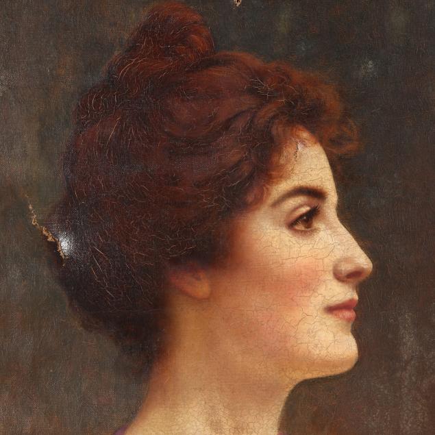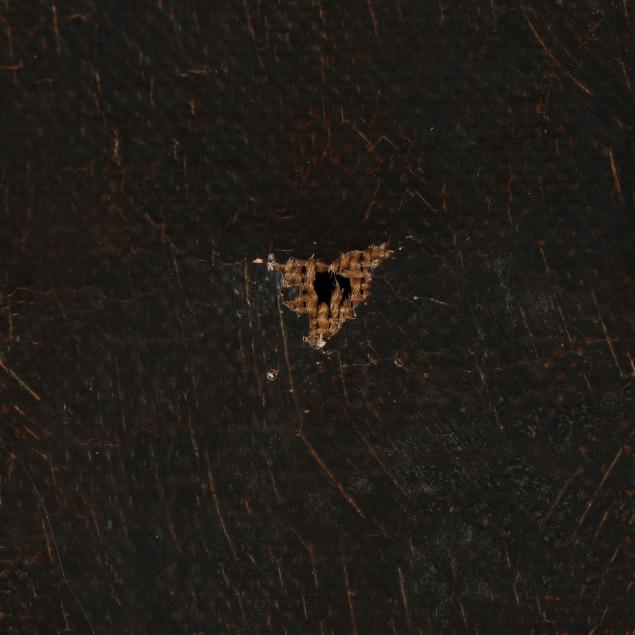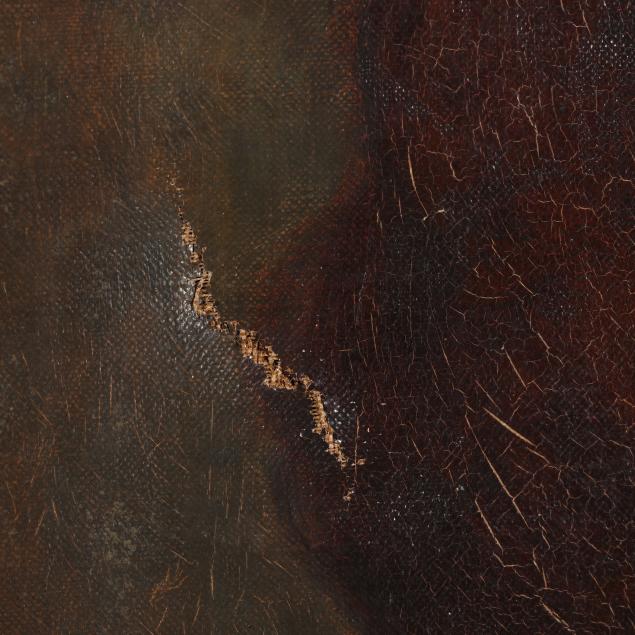 Tear at upper left corner, puncture at upper edge, and a one-inch puncture to the subject's forehead, age cracking and waviness to the canvas.