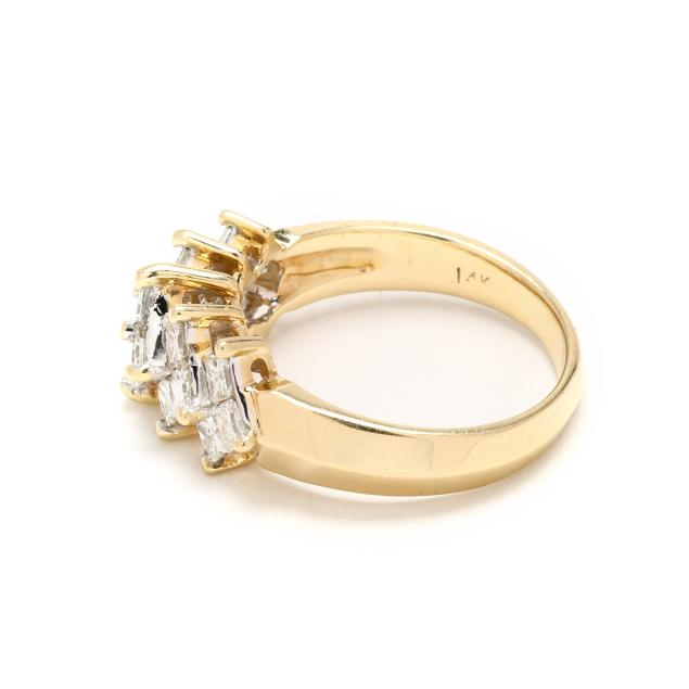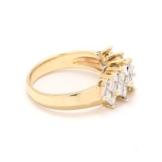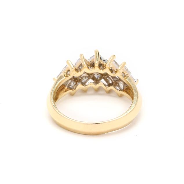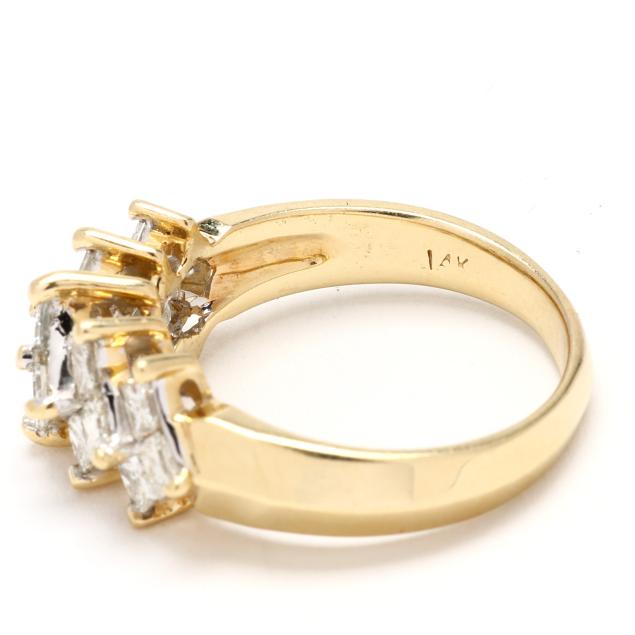 The tiered design with invisible set with princess cut diamonds weighing approximately 1.90 total carats (H-I color, SI1-SI2 clarity), completed with a knife edge shank, stamped 14K.