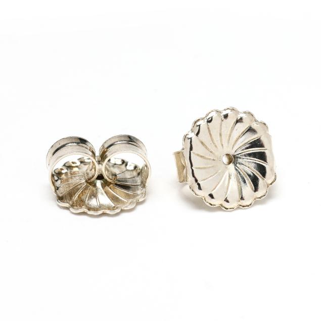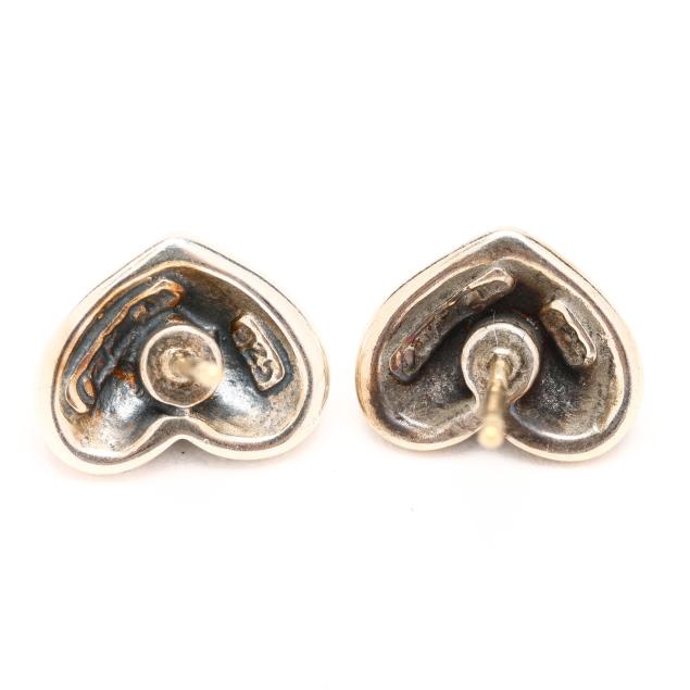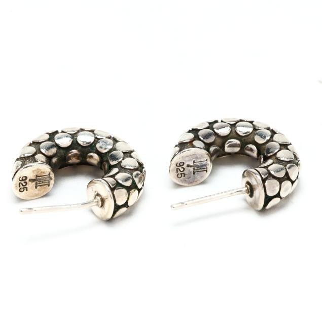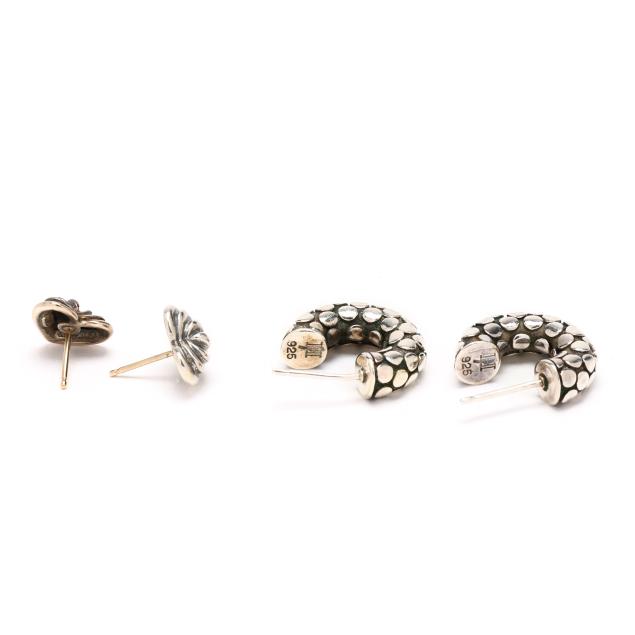 To include: a pair of stud earrings in a concentric heart design, completed with post and friction backs, stamped 925 / signed Caviar (Lagos) (3/8 x 7/16 in.); and a pair of hoop earrings, from the Dot collection by John Hardy, in a half-hoop form, completed with a post and friction backs, signed and stamped 925 (3/4 in.).