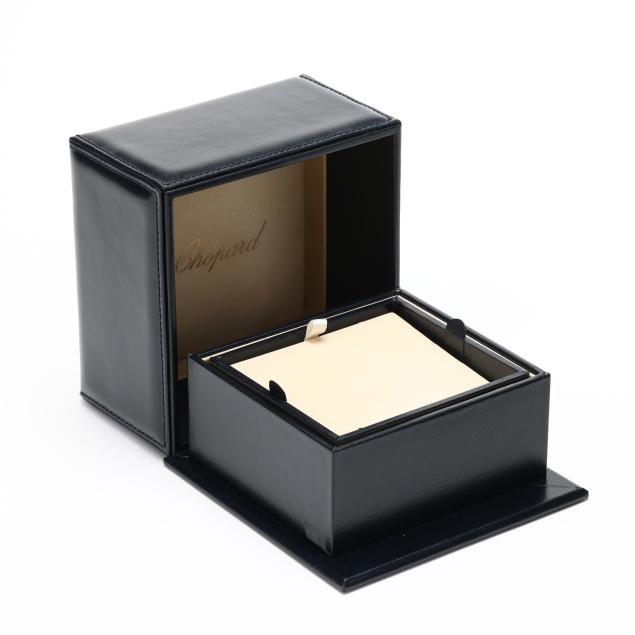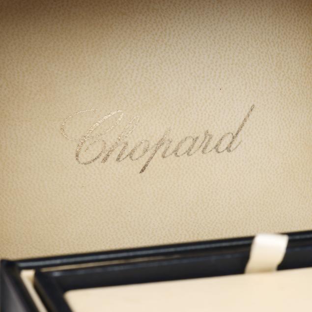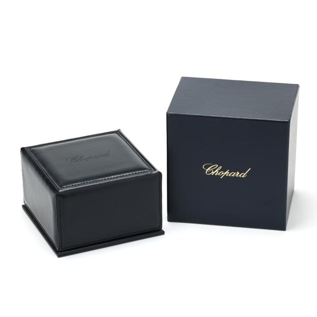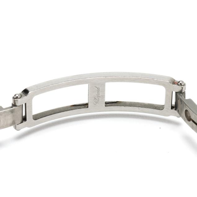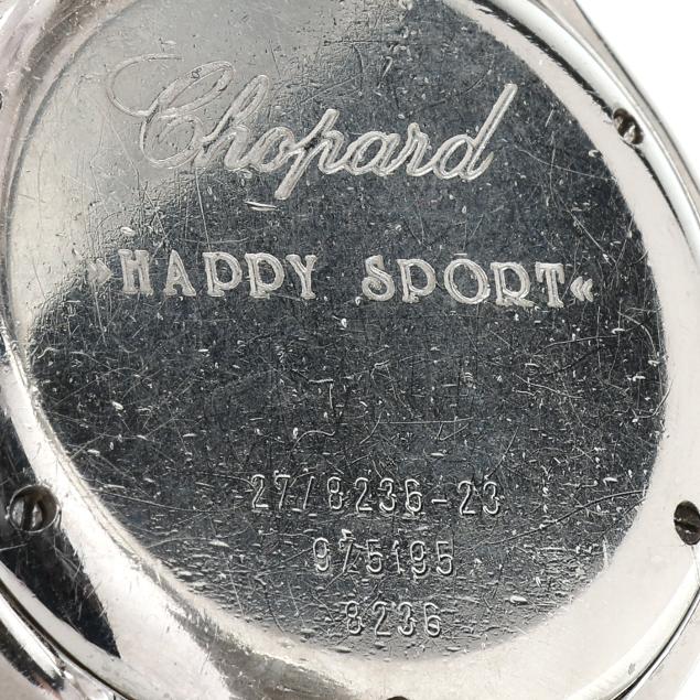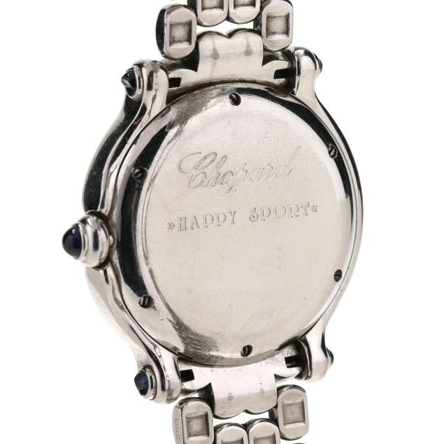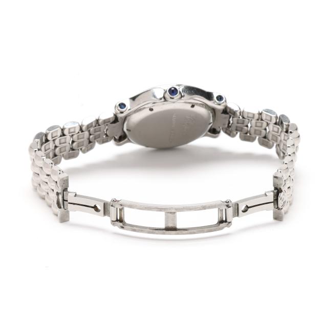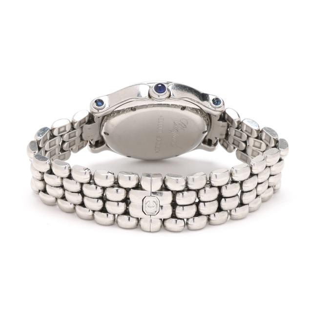 Quartz, reference number 27/8236-23, serial number 975195, the round stainless steel case with polished bezel, cabochon cut sapphire set to lugs and crown, and double sapphire crystal containing seven free floating bezel set diamonds, the signed white dial with black Roman numeral hour markers, blued steel sword hands, and date window at 6:00 hour, the stainless steel bracelet stamped L.U.C. and completed with a signed butterfly deployant clasp, the caseback signed and numbered 27/8236-23 / 975195 / 8236.