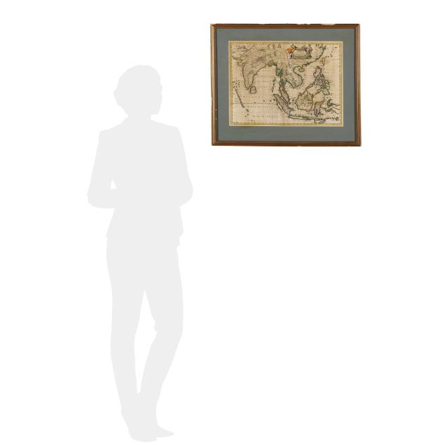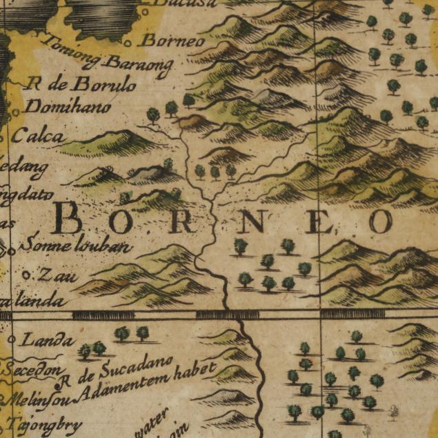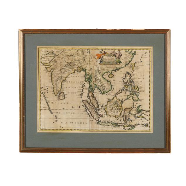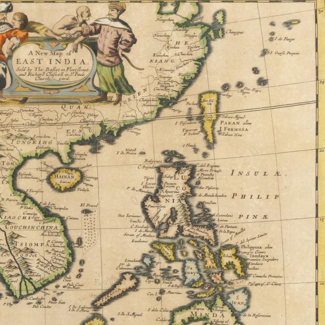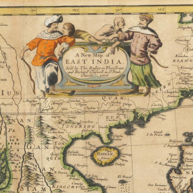 John Speed. A NEW MAP OF EAST INDIA. London: Tho[mas] Basset and Richard Chiswell, 1676; a double-page map engraved by F. Lamb, with hand-coloring; depicts part of South Asia including India and the Maldives and Southeast Asia through to the Philippines and the Indonesian archipelago; with decorative figural title cartouche; the verso offers two pages in English titled