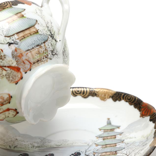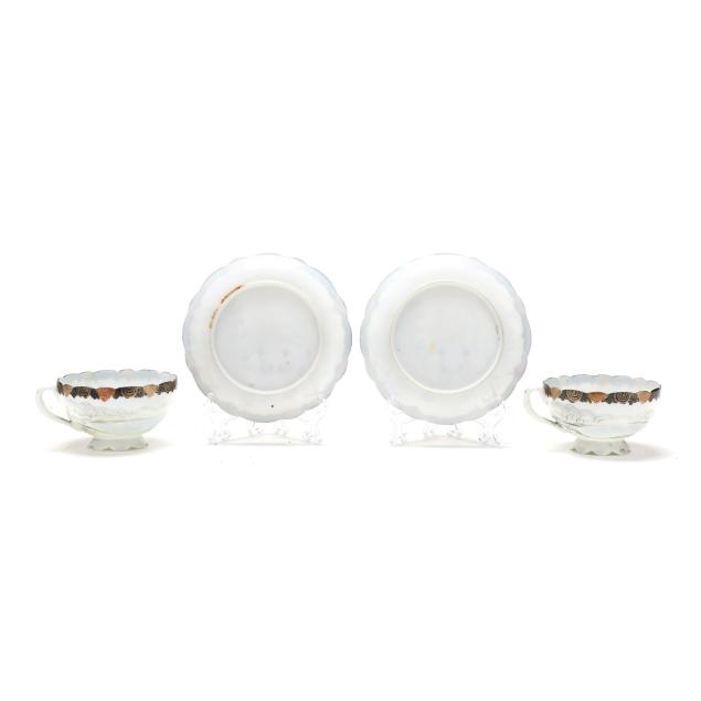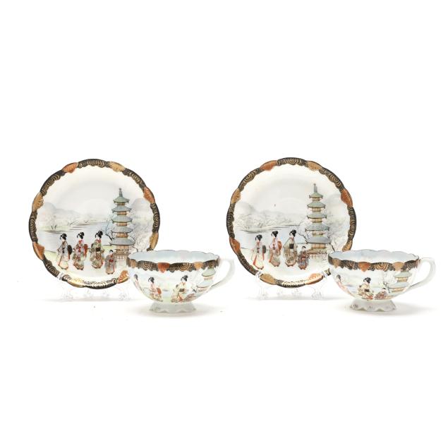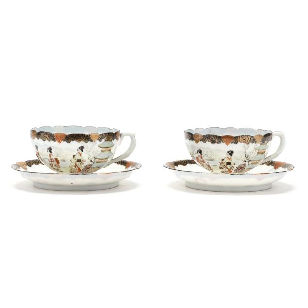 a-pair-of-japanese-porcelain-teacups-with-saucers-and-a-mixed-metal-plaque