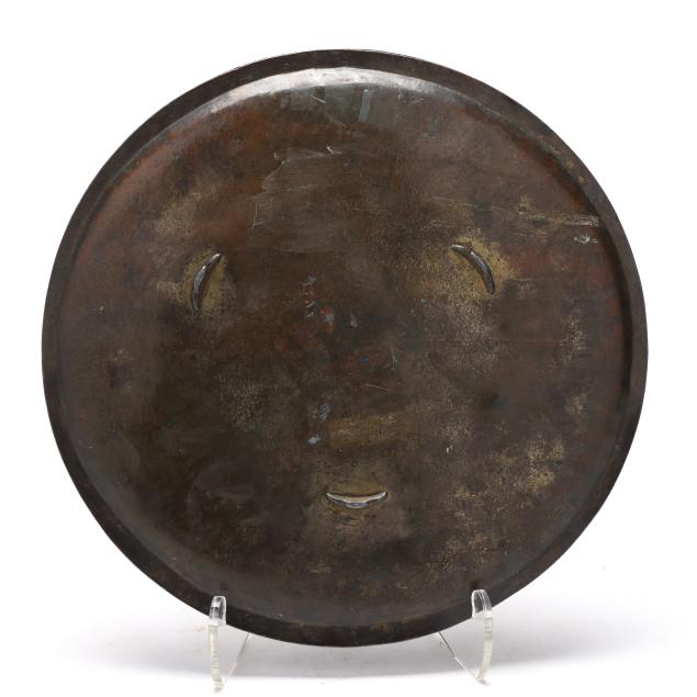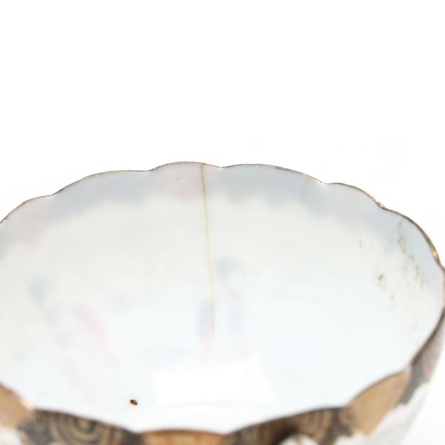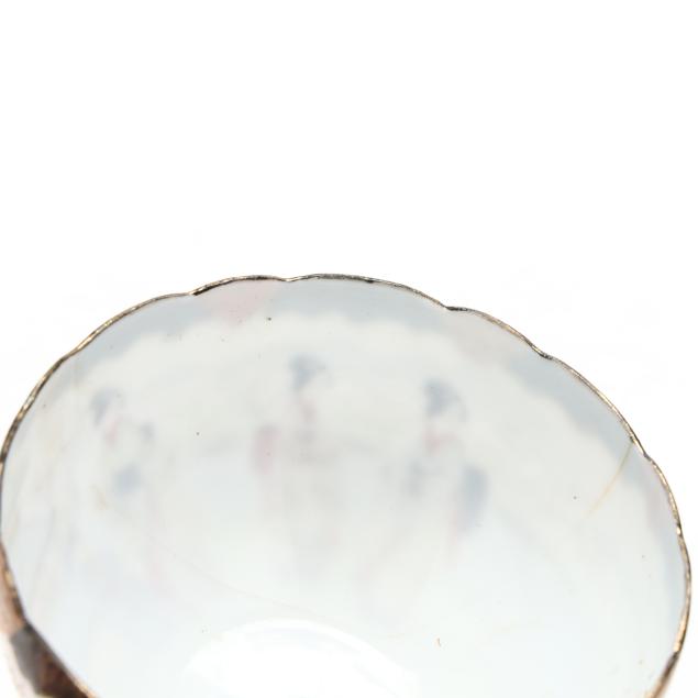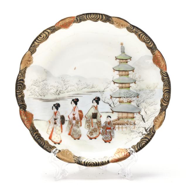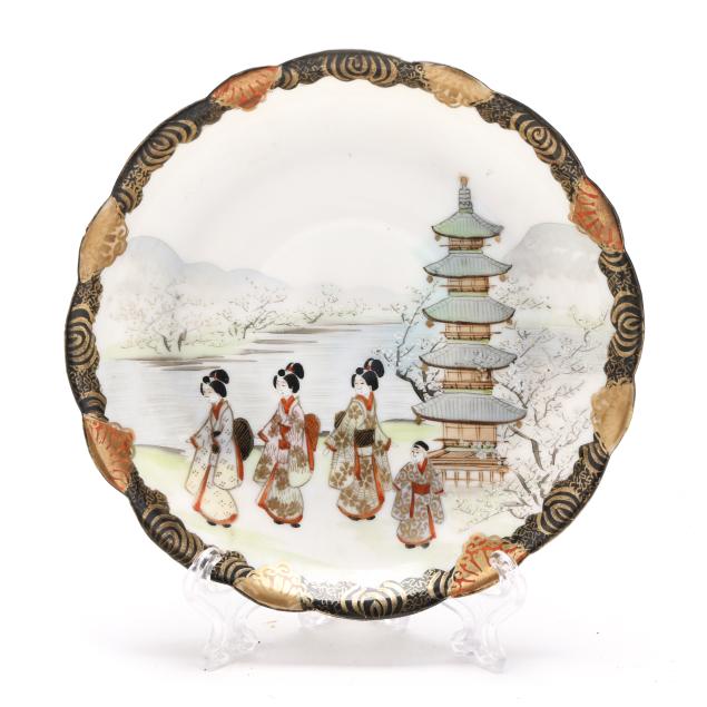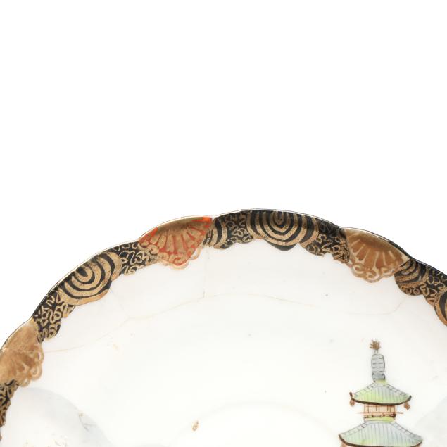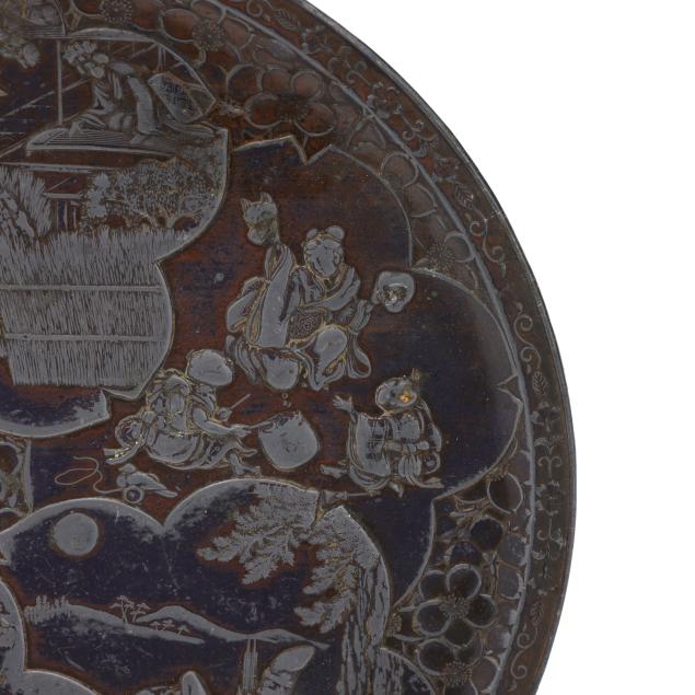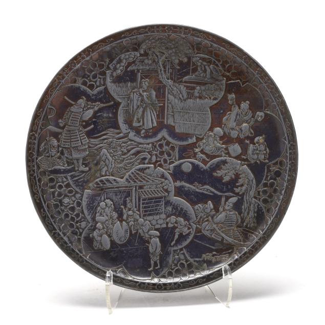 Early 20th century, includes a pair of porcelain teacups with saucers hand painted with scenes of elegant ladies visiting a temple (cup 2 1/8 in., saucer 5 1/2 in.), and a mixed metal plaque with lobed shaped blossom reserves decorated with scenes from Japanese narrative (12 1/8 in. diameter).