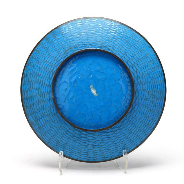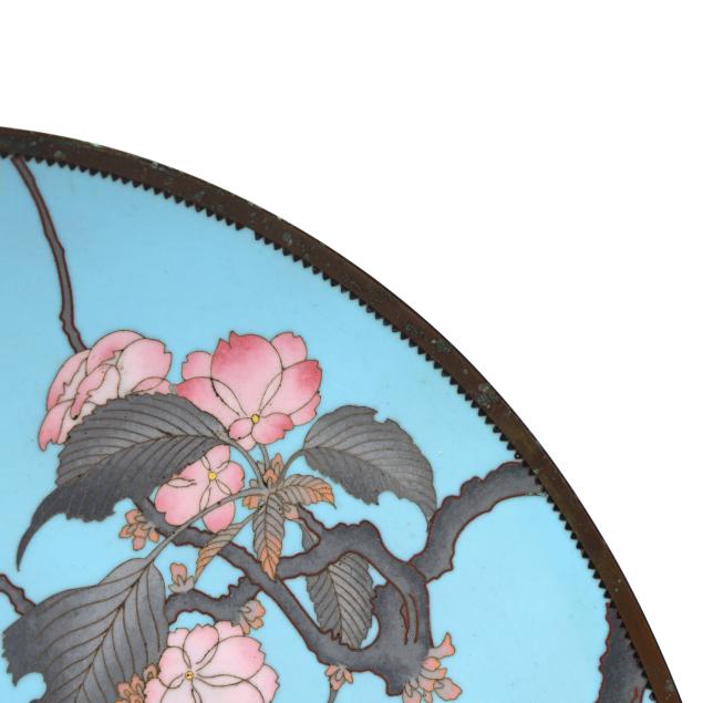 Meiji period (1868-1912), a large cloisonne dish with copper and silver wire in musen shippo (wireless) technique, featuring a rare scene of ships filled with straw on the sea with mountains in the background, in the foreground stunning pink cherry blossoms cascade over the scene, light blue enamels to reverse with wave cloisonne pattern, unmarked.