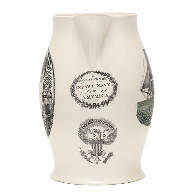 Large Commemorative Liverpool Creamware Pitcher, Success to the Infant Navy of America