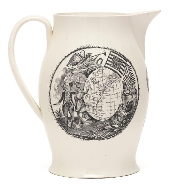 British, circa late 18th century, lead glazed creamware with transfer, scenes and text celebrating the United States Navy, the phrase “SUCCESS TO THE / INFANT NAVY / OF / AMERICA” within a laurel cartouche beneath the spout above the patriotic Great Seal of the United States eagle. One side's transfer depicts Washington and Liberty standing beside a Map of the United States. Benjamin Franklin, “Justice” and “America” stand on the other side of the Map, and a winged Herald above is shown carrying a laurel wreath and ribbon with the name “WASHINGTON”. The other side with an unidentified American naval vessel with polychrome highlights flying a sixteen star American Flag.