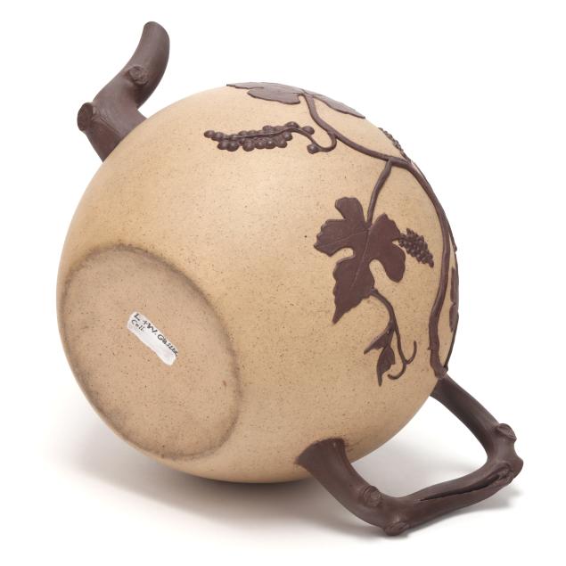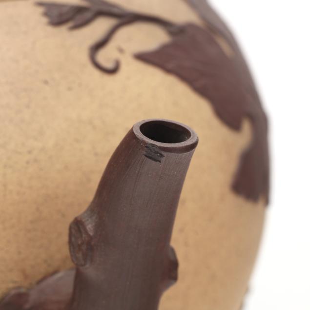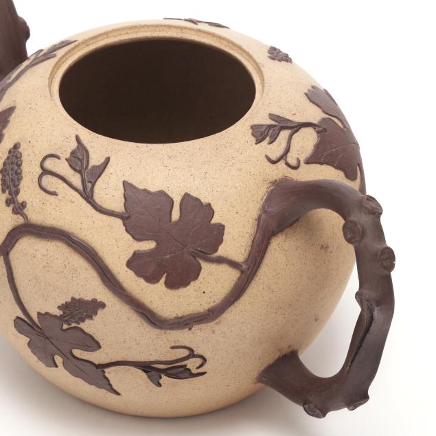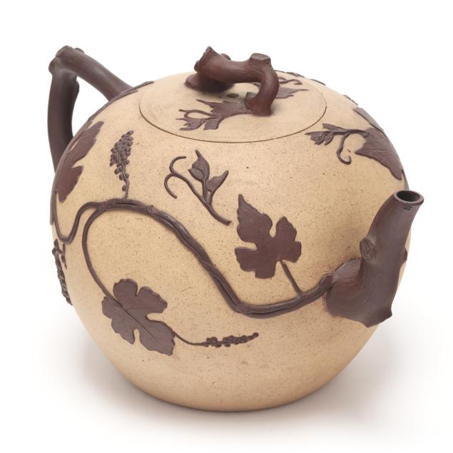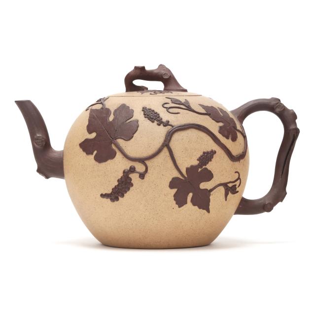 Chinese, circa 1760-1780, buff unglazed stoneware with relief applique decor of leaves and grapes, the spout and handles in the form of pruned branches, unmarked.