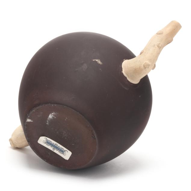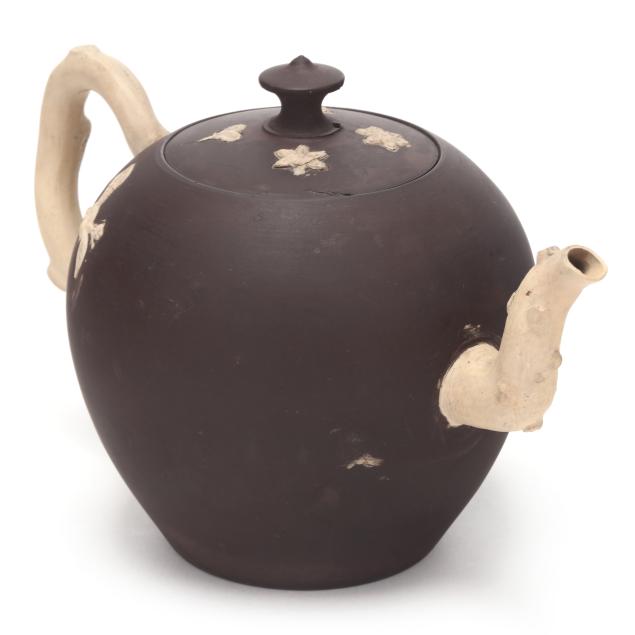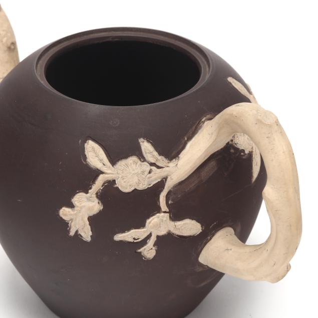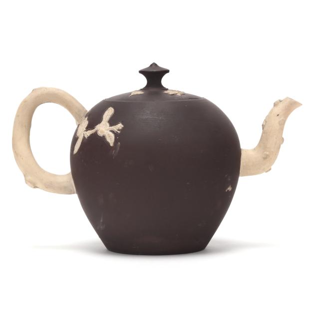 British, third quarter 18th century, stoneware, buff handle and spout in the form of pruned branches, redware body and cover with buff fruit blossom branch relief applique, unmarked save London based dealer label of Jonathan Horne to the underside.