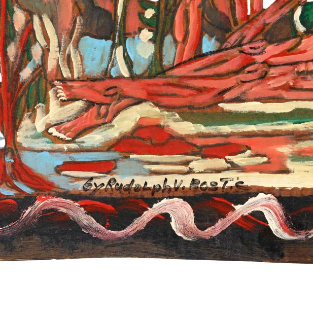 From the Estate of the late Susan C. Frankenberg, Hillsborough, North Carolina Rudolph Bostic was a self-taught folk artist from Savannah, Georgia, known for his boldly colored, imaginative paintings depicting biblical stories, historical figures, and African American life. With no formal training, he created art on found materials like cardboard and poster board, transforming everyday items into expressive, dreamlike scenes. Blending themes of faith, resilience, and culture, Bostic’s work has been widely exhibited and collected, earning him recognition as a major figure in Southern folk art.