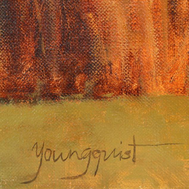 Private Collection, Raleigh, North Carolina Romona Youngquist is a self-taught oil painter recognized for her atmospheric landscapes inspired by the rural scenery of Oregon’s wine country, where she lives and works. Raised in eastern Oklahoma, she developed an early connection to nature that continues to shape her work. Using a muted palette and layered surface techniques—including sanding and scraping—Youngquist creates paintings that evoke a sense of quiet nostalgia. Her work has been exhibited in galleries across the United States and has been featured in major art publications.
