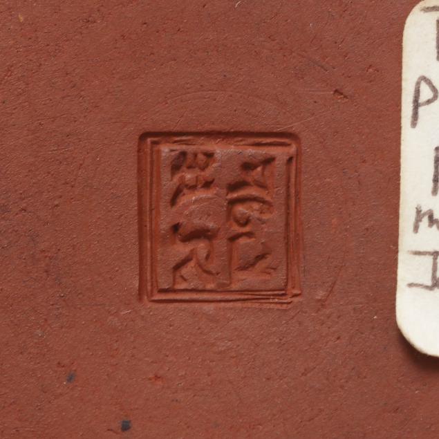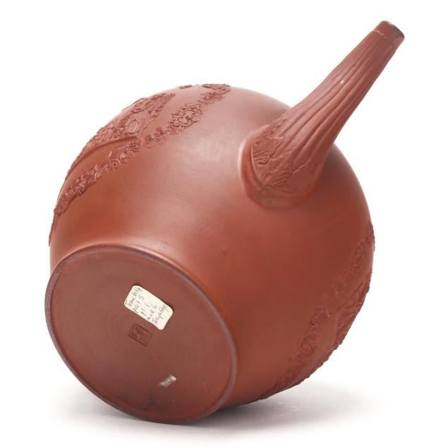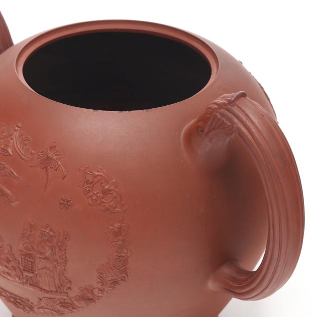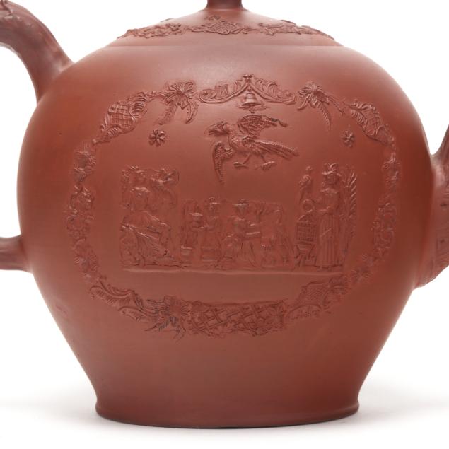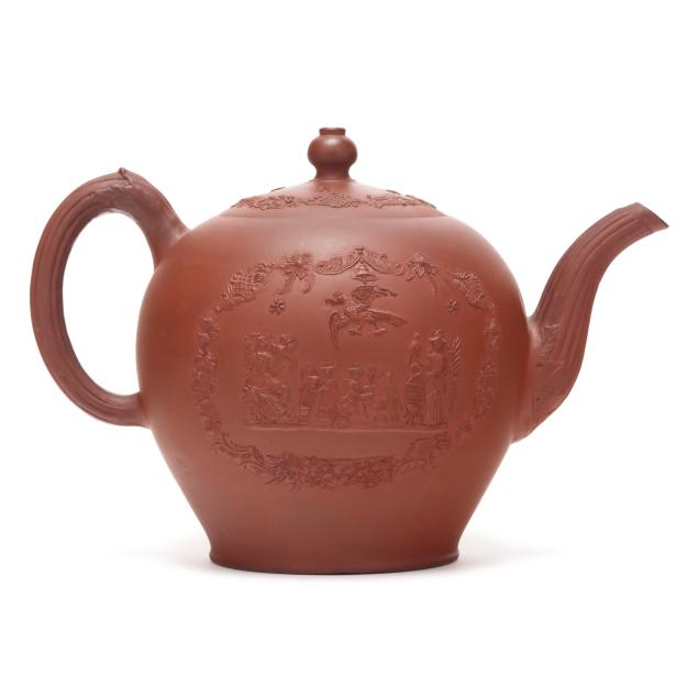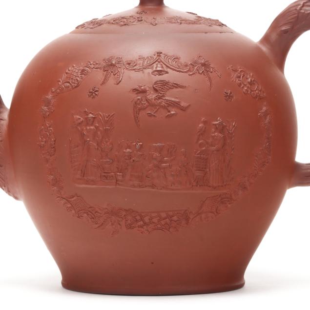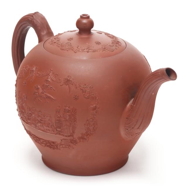 British, mid-18th century, unglazed redware, of rotund spherical form with conforming cover, each side depicting figural relief vignettes of female figures with exotic birds set within an ornamental Chinese inspired lattice and floral swag cartouche, between a molded barleycorn handle and spout, underside with Chinese style character mark.