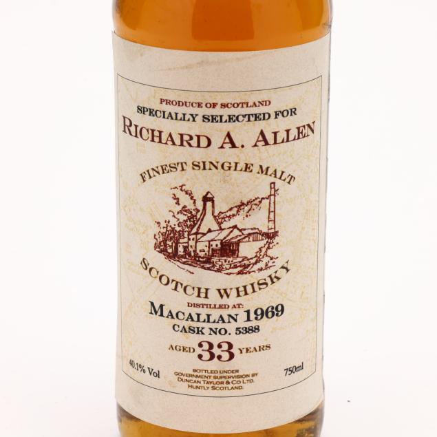 Vintage 1969, Macallan Finest Single Malt Scotch Whisky, 33 Years Old, Duncan, Taylor & Co., Ltd., Huntly, Scotland, 40.1%, cask no. 5388, into neck, sealed, specifically selected for Richard A. Allen (1 750 ml)