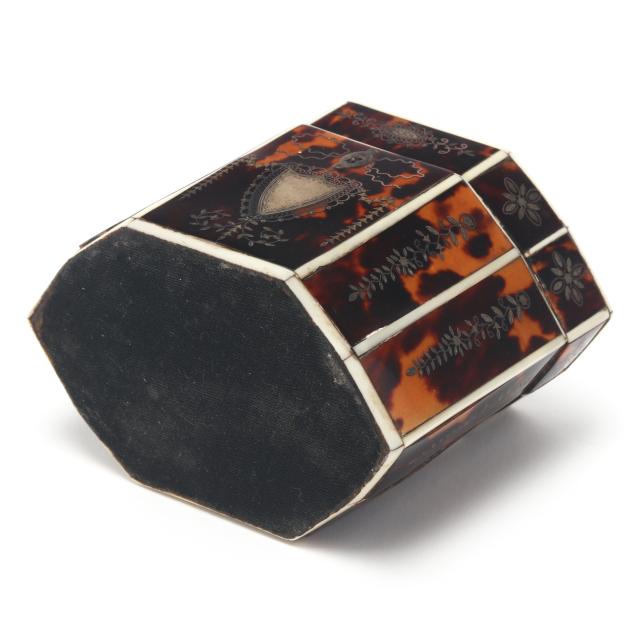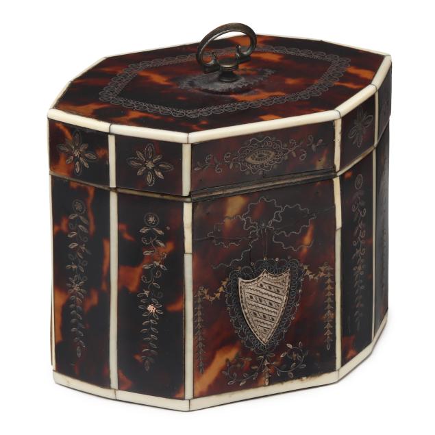 English, late 18th century, unsigned, of faceted navette form featuring tortoiseshell panels, finely inlaid with silver and gilt floral and shield plaque piqué work designs, inlaid key escutcheon, and hinged lid opening to a lined compartment with cover.