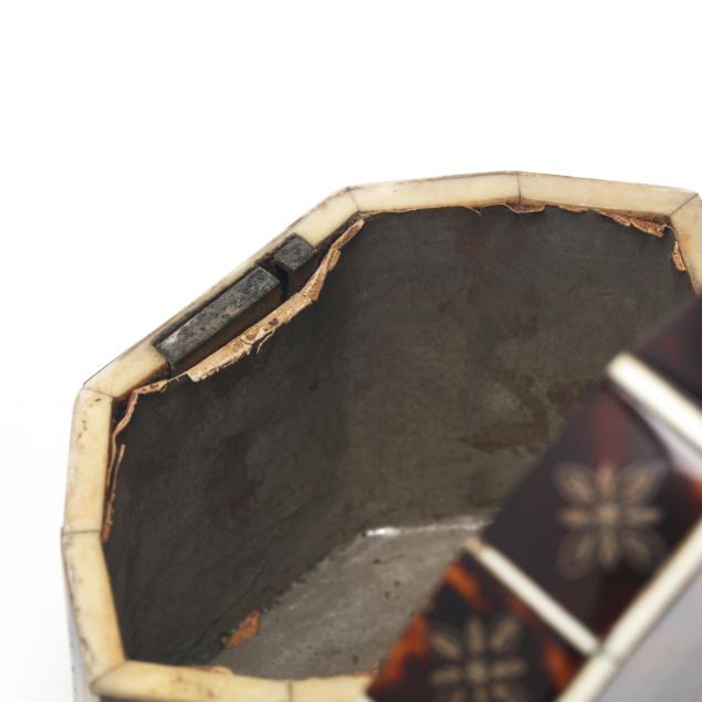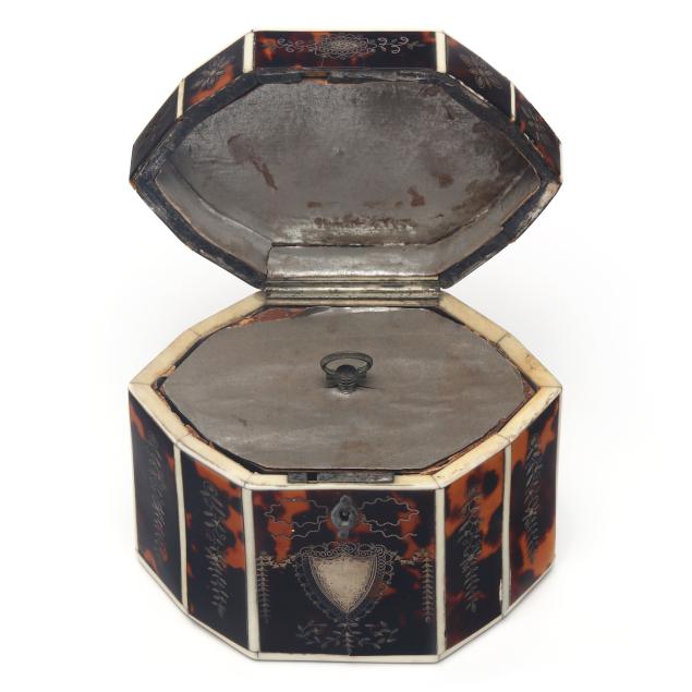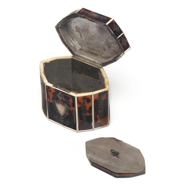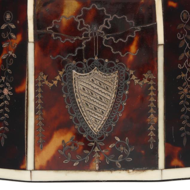 From the Collection of Josephine Chapman Borthwick, Pinehurst, North Carolina Old but later paper to interior, retaining some of the original lined surfaces beneath; areas of surface staining; tight crack to rear tortoiseshell panel above shield and a few small cracks to borders; lower lock present, but lid without lock clasp; interior missing lid corner supports (interior cover loose); without key.