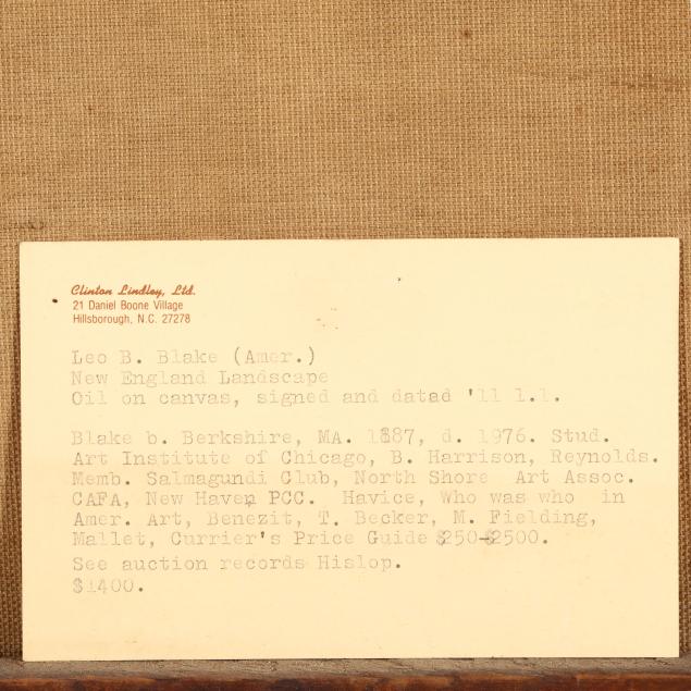 From the Estate of the late Susan C. Frankenberg, Hillsborough, North Carolina Leo B. Blake received his formal training at the Art Institute of Chicago from 1908 to 1912, where he studied under influential instructors such as J.H. Vanderpoel, Alphonse Mucha, and Antonin Sterba. He was further mentored by renowned painters including Mathis Alten and Birge Harrison. Awarded scholarships in 1910 and 1911, Blake began his career in illustration and commercial art before shifting his focus to fine art. In 1933, he established a permanent studio in the Berkshires, dedicating himself to capturing the landscapes and seasonal beauty of New England.