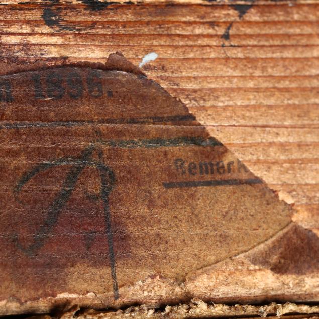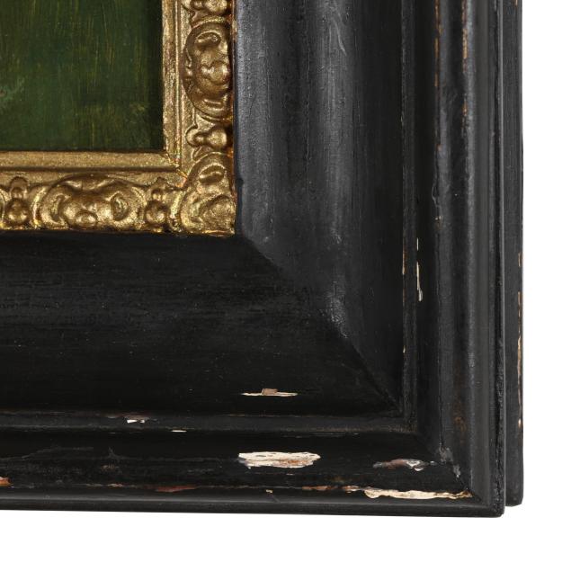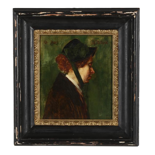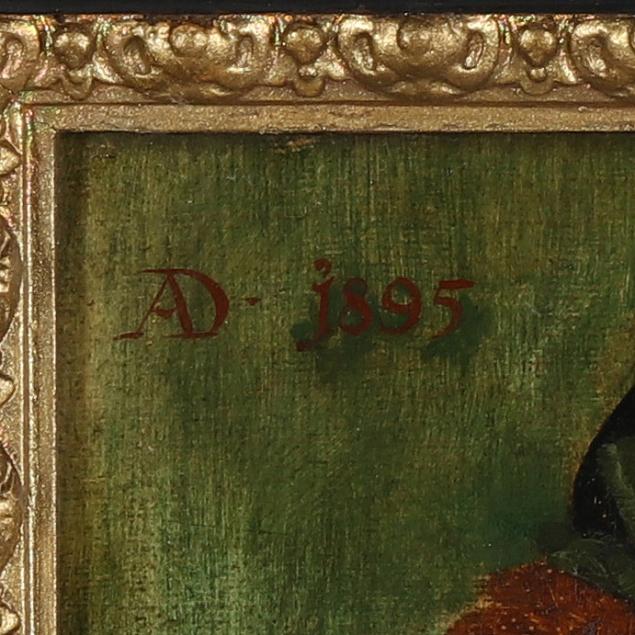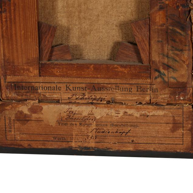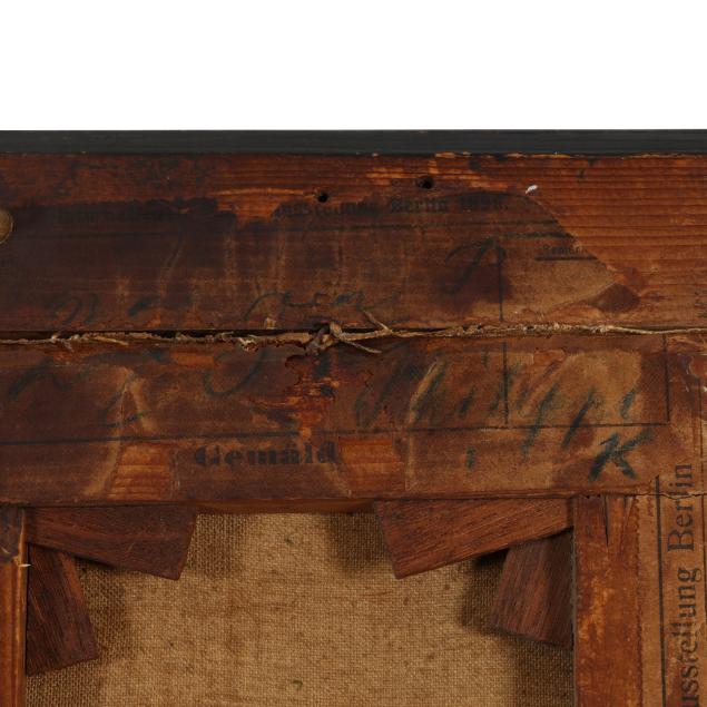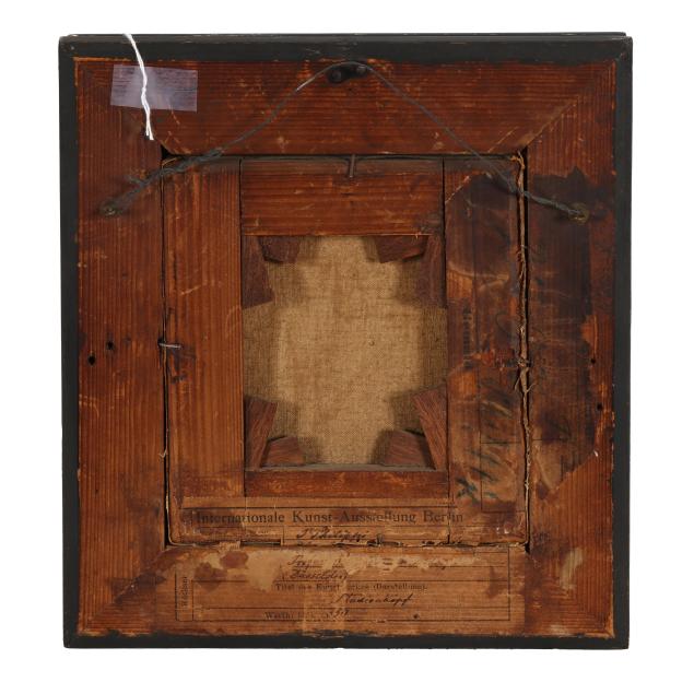 Oil on canvas, 1895, signed at upper right and dated at upper left, presented in a period ebonized and gilt cassetta frame, retaining two exhibition labels for the 1896 Internationale Kunst - Ausstellung in Berlin.