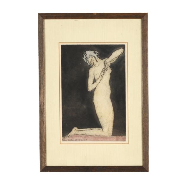 Color soft-ground etching and aquatint on paper, 1922, second state of 2, from an edition of 45, signed and pencil inscribed to lower left, retaining gallery label to verso, matted and framed below glass.