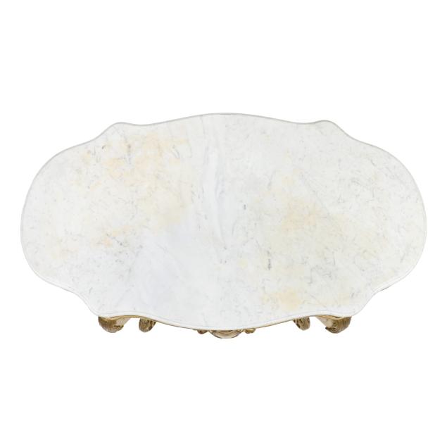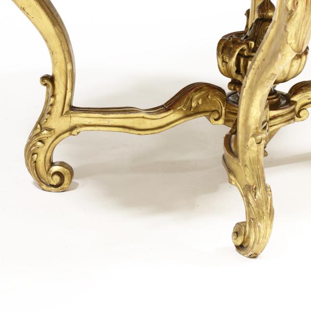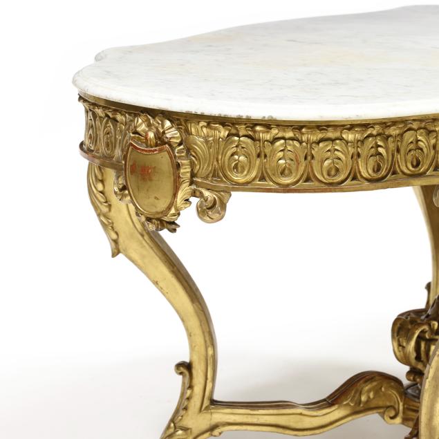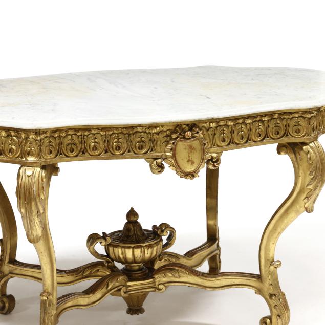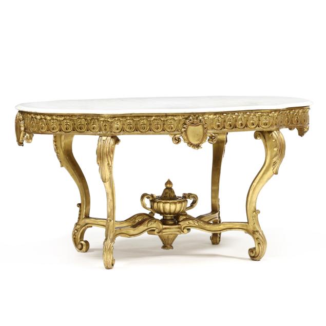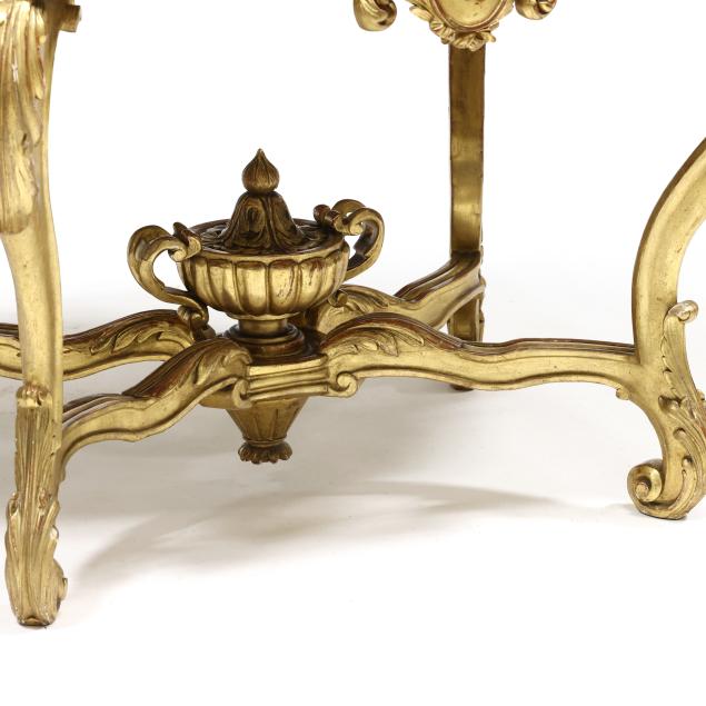 Late 19th, early 20th century, shaped white marble top with molded edge, wood and gesso carved and gilt conforming skirt with central plaque and ribbon motifs, cabriole legs with acanthus leaf, shaped stretcher supports with large carved doubled handled urn finial.