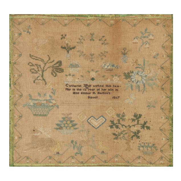 Pennsylvania, 1827, silk on linen, with "Catharine Wolf worked this sam- / Pler in the 12th year of her age in / Miss Esther R Barton's / School. 1827" to center, surrounded by detached floral and fauna motifs including butterfly, baskets of flowers, and birds, with twining rosebud border, green ribbon stitched to edges, presented in frame.