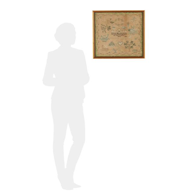 The young girl who stitched this sampler may have been Catharine Wolff of Lancaster, Pennsylvania, born in 1815 to John and Salome Wolff, and in fact the initials "JSW" are stitched in the floral wreath at the upper center of the sampler and would have been the initials of a parent or close relative. Catharine Wolff of Lancaster died a single woman in 1896, her obituary stating that she was, "a woman of sterling qualities and strong common sense."