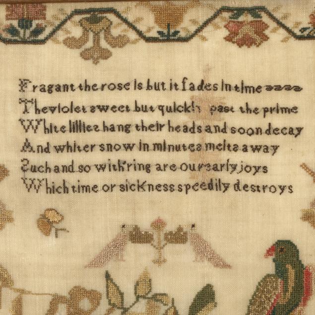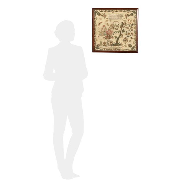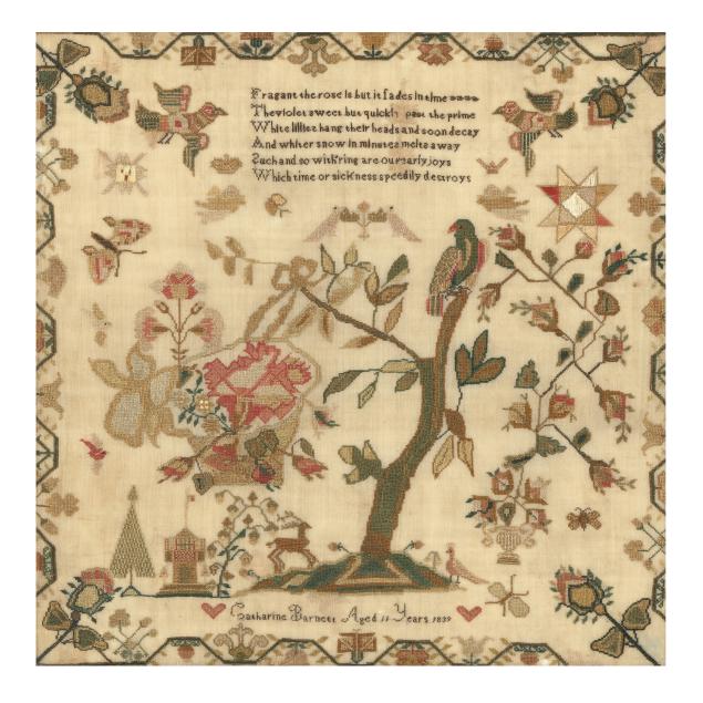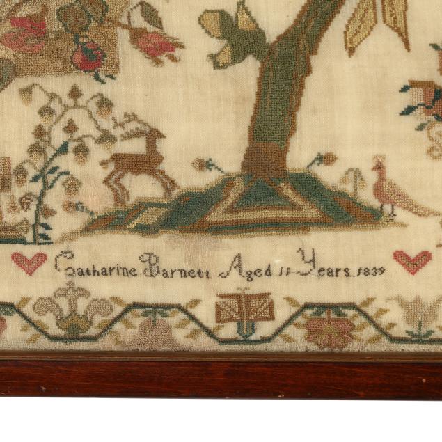 1839, silk on fine linen, worked in cross stitch and satin stitch, the central tree motif with hanging basket of imaginative flowers, surrounded by fanciful bird, butterfly, and floral motifs, the upper register with lines from Theocritus' Idyll 23, signed "Catharine Barnett Ages 11 Years 1839" to lower register with hearts, the border with twining flowers and berries, in two-tone wooden frame.