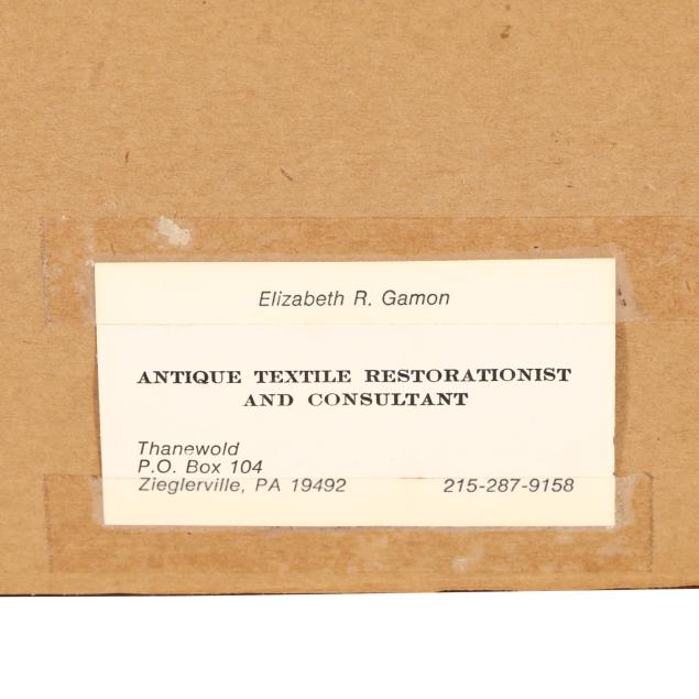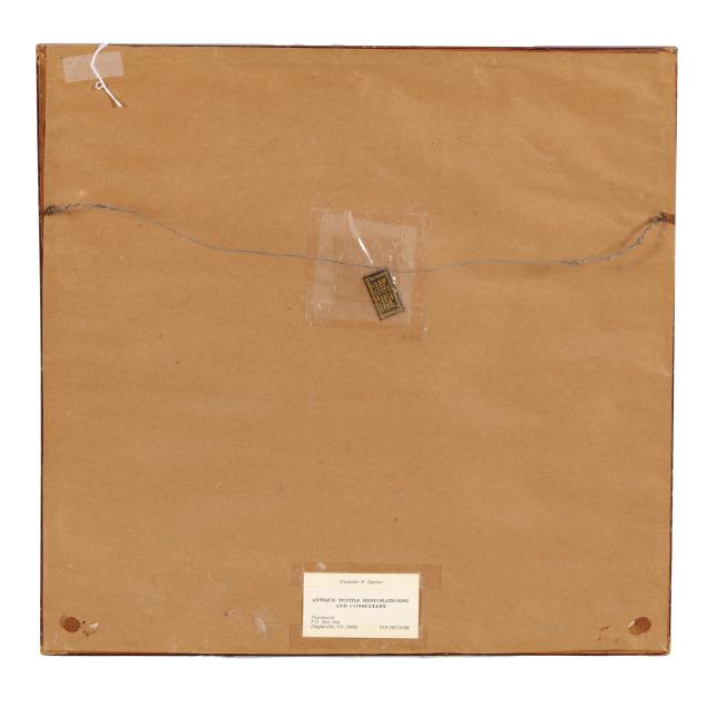 From the Collection of Josephine Chapman Borthwick, Pinehurst, North Carolina Fading, but still attractive pink, green, and gold colors to silk; some small holes in linen ground; repairs; some areas of discoloration; scuffs to frame; not examined out of frame.